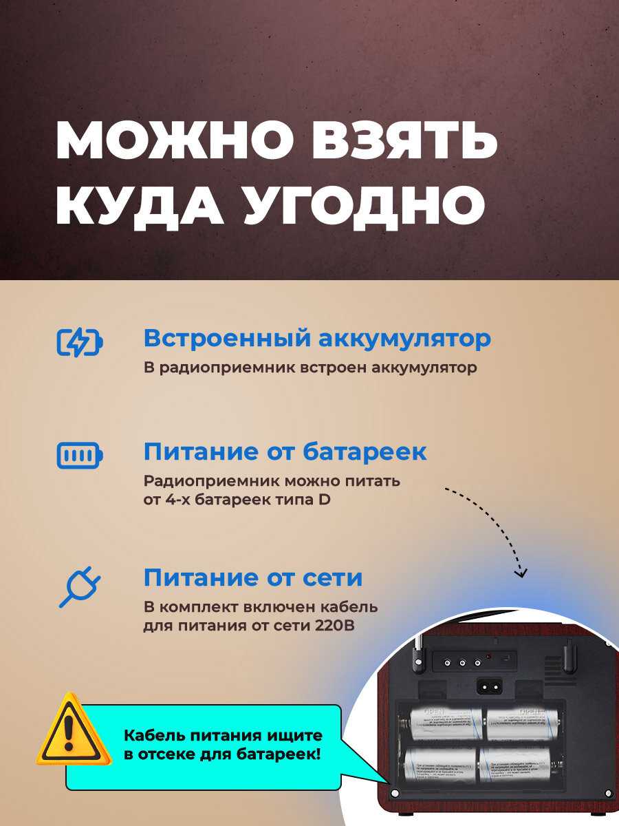 ΠΠΎΠ΄Π΅Π»Ρ ΠΏΡΠ΅Π΄Π»Π°Π³Π°Π΅Ρ ΡΠΈΡΠΎΠΊΡΡ ΡΡΠ½ΠΊΡΠΈΠΎΠ½Π°Π»ΡΠ½ΠΎΡΡΡ, Π²ΡΡ ΠΎΠ΄ΡΡΡΡ Π·Π° ΡΠ°ΠΌΠΊΠΈ ΠΏΡΠΎΡΡΠΎΠ³ΠΎ ΡΠ°Π΄ΠΈΠΎΠΏΡΠΈΠ΅ΠΌΠ½ΠΈΠΊΠ°. ΠΠΎΠ»ΡΠ·ΠΎΠ²Π°ΡΠ΅Π»ΠΈ Π°ΠΊΡΠΈΠ²Π½ΠΎ ΠΈ ΡΡΠΏΠ΅ΡΠ½ΠΎ ΠΈΡΠΏΠΎΠ»ΡΠ·ΡΡΡ: Π²ΠΎΡΠΏΡΠΎΠΈΠ·Π²Π΅Π΄Π΅Π½ΠΈΠ΅ MP3 Ρ USB-ΡΠ»Π΅ΡΠ΅ΠΊ (ΡΠΎΡΠΌΠ°Ρ FAT32) ΠΈ SD-ΠΊΠ°ΡΡ, Π±Π΅ΡΠΏΡΠΎΠ²ΠΎΠ΄Π½ΠΎΠ΅ ΠΏΠΎΠ΄ΠΊΠ»ΡΡΠ΅Π½ΠΈΠ΅ ΠΏΠΎ Bluetooth (ΠΎΡΠΌΠ΅ΡΠ°Π΅ΡΡΡ Π»Π΅Π³ΠΊΠΎΠ΅ ΠΈ Π±ΡΡΡΡΠΎΠ΅ ΡΠΎΠΏΡΡΠΆΠ΅Π½ΠΈΠ΅), Π° ΡΠ°ΠΊΠΆΠ΅ AUX-Π²Ρ ΠΎΠ΄. ΠΠ»ΡΡΠ΅Π²Π°Ρ ΠΎΡΠΎΠ±Π΅Π½Π½ΠΎΡΡΡ β Π³ΠΈΠ±ΠΊΠΎΡΡΡ ΠΏΠΈΡΠ°Π½ΠΈΡ: ΡΠ°Π±ΠΎΡΠ° ΠΎΡ ΡΠ΅ΡΠΈ 220Π, ΠΎΡ Π²ΡΡΡΠΎΠ΅Π½Π½ΠΎΠ³ΠΎ Π°ΠΊΠΊΡΠΌΡΠ»ΡΡΠΎΡΠ° 18650 (ΠΎΠ±Π΅ΡΠΏΠ΅ΡΠΈΠ²Π°Π΅Ρ, ΠΏΠΎ ΠΎΡΠ·ΡΠ²Π°ΠΌ, Π½Π΅ΡΠΊΠΎΠ»ΡΠΊΠΎ ΡΠ°ΡΠΎΠ² ΡΠ°Π±ΠΎΡΡ β "2-3 ΡΠ°ΡΠ° Π² Π΄Π΅Π½Ρ Ρ Π²Π°ΡΠ°Π΅Ρ ΠΏΠΎΡΡΠΈ Π½Π° Π½Π΅Π΄Π΅Π»Ρ") ΠΈ ΠΎΡ ΡΠΌΠ΅Π½Π½ΡΡ Π±Π°ΡΠ°ΡΠ΅Π΅ΠΊ ΡΠΈΠΏΠ° ΠΠ (3 ΡΡΡΠΊΠΈ) ΡΠ΅ΡΠ΅Π· ΠΎΡΠ΄Π΅Π»ΡΠ½ΡΠΉ ΠΎΡΡΠ΅ΠΊ Ρ ΠΏΠ΅ΡΠ΅ΠΊΠ»ΡΡΠ°ΡΠ΅Π»Π΅ΠΌ Π½Π° Π·Π°Π΄Π½Π΅ΠΉ ΠΏΠ°Π½Π΅Π»ΠΈ. ΠΡΠ° ΡΠ½ΠΈΠ²Π΅ΡΡΠ°Π»ΡΠ½ΠΎΡΡΡ ΠΏΠΎΠ·Π²ΠΎΠ»ΡΠ΅Ρ ΠΈΡΠΏΠΎΠ»ΡΠ·ΠΎΠ²Π°ΡΡ ΠΏΡΠΈΠ΅ΠΌΠ½ΠΈΠΊ ΠΊΠ°ΠΊ ΡΡΠ°ΡΠΈΠΎΠ½Π°ΡΠ½ΠΎ, ΡΠ°ΠΊ ΠΈ ΠΌΠΎΠ±ΠΈΠ»ΡΠ½ΠΎ (Π² ΡΠ°Π΄Ρ, Π½Π° ΠΎΠ³ΠΎΡΠΎΠ΄Π΅, Π½Π° ΠΏΡΠΈΡΠΎΠ΄Π΅), ΡΡΠΎ ΠΎΡΠΎΠ±Π΅Π½Π½ΠΎ ΡΠ΅Π½ΠΈΡΡΡ ΠΏΠΎΠ»ΡΠ·ΠΎΠ²Π°ΡΠ΅Π»ΡΠΌΠΈ. ΠΠ΄Π½Π°ΠΊΠΎ ΡΠ°Π±ΠΎΡΠ° ΠΎΡ Π²ΡΡΡΠΎΠ΅Π½Π½ΠΎΠ³ΠΎ ΠΠΠ ΠΈΠ½ΠΎΠ³Π΄Π° ΡΡΠ΅Π±ΡΠ΅Ρ ΡΠΏΠ΅ΡΠΈΡΠΈΡΠ½ΡΡ Π΄Π΅ΠΉΡΡΠ²ΠΈΠΉ (Π½Π°ΠΏΡΠΈΠΌΠ΅Ρ, Π²ΡΠ½ΡΡΡ ΡΠ΅ΡΠ΅Π²ΠΎΠΉ ΡΠ½ΡΡ ΠΏΠΎΡΠ»Π΅ Π·Π°ΡΡΠ΄ΠΊΠΈ).
