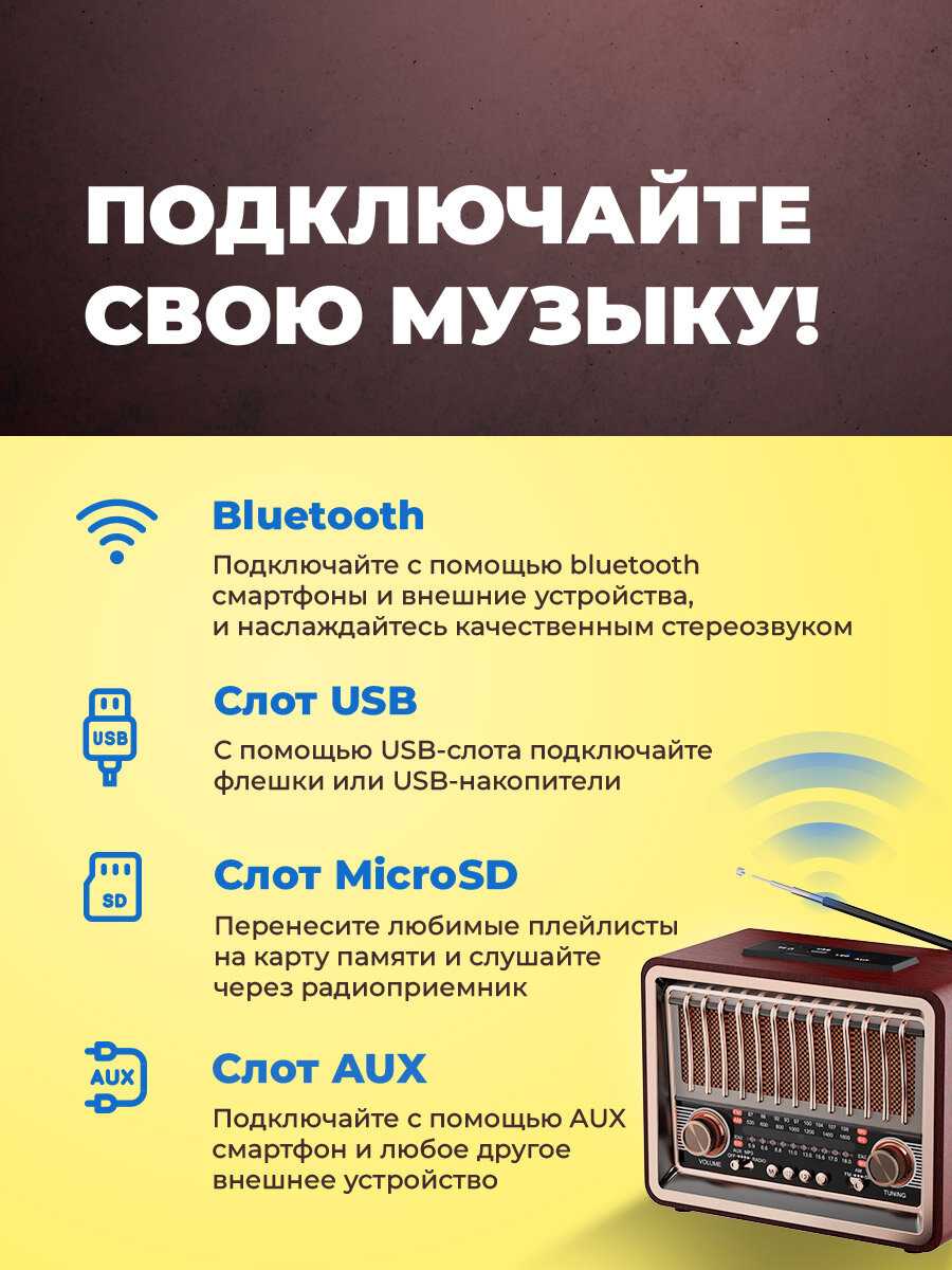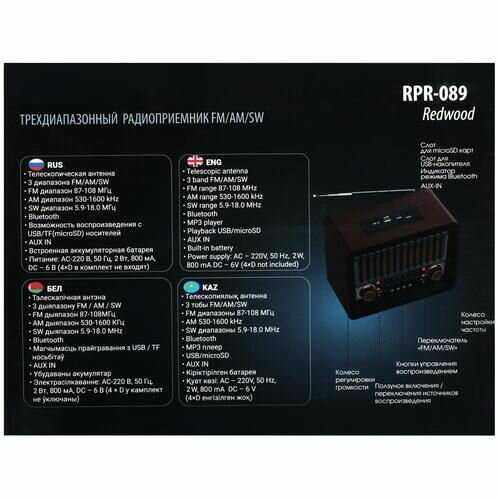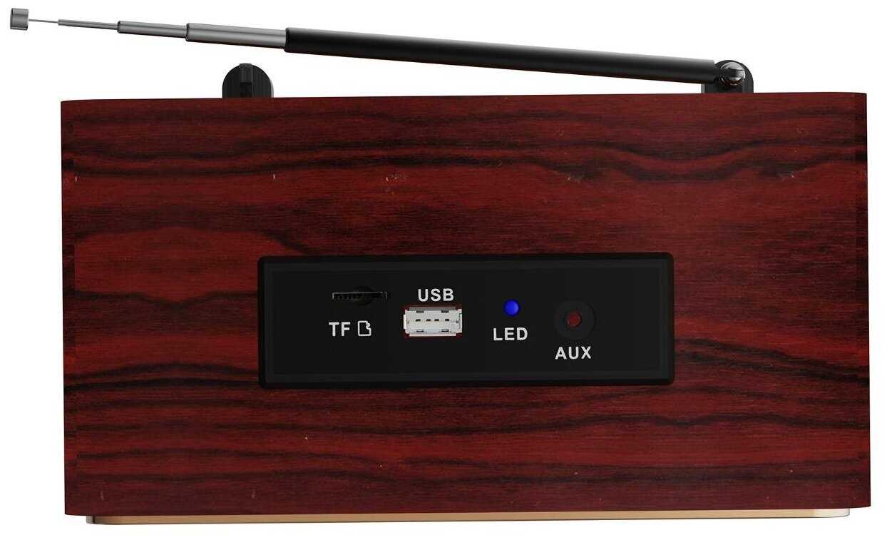 Π£ΡΡΡΠΎΠΉΡΡΠ²ΠΎ ΠΏΠΎΠ»Π½ΠΎΡΡΠ½ΠΊΡΠΈΠΎΠ½Π°Π»ΡΠ½ΠΎ: ΠΏΠΎΠΌΠΈΠΌΠΎ FM/AM-ΡΠ°Π΄ΠΈΠΎ, ΠΎΠ½ΠΎ Π²ΠΎΡΠΏΡΠΎΠΈΠ·Π²ΠΎΠ΄ΠΈΡ Π°ΡΠ΄ΠΈΠΎ Ρ USB-ΡΠ»Π΅ΡΠ΅ΠΊ, SD-ΠΊΠ°ΡΡ (ΠΏΠΎΠ΄Π΄Π΅ΡΠΆΠΈΠ²Π°Π΅Ρ FAT32), ΡΠ°Π±ΠΎΡΠ°Π΅Ρ ΠΊΠ°ΠΊ Bluetooth-ΠΊΠΎΠ»ΠΎΠ½ΠΊΠ° ΠΈ ΠΈΠΌΠ΅Π΅Ρ AUX-Π²Ρ ΠΎΠ΄ Π΄Π»Ρ ΠΏΡΠΎΠ²ΠΎΠ΄Π½ΠΎΠ³ΠΎ ΠΏΠΎΠ΄ΠΊΠ»ΡΡΠ΅Π½ΠΈΡ. ΠΠ΅ΡΠ΅ΠΊΠ»ΡΡΠ΅Π½ΠΈΠ΅ ΠΌΠ΅ΠΆΠ΄Ρ ΡΠ΅ΠΆΠΈΠΌΠ°ΠΌΠΈ ΠΎΡΡΡΠ΅ΡΡΠ²Π»ΡΠ΅ΡΡΡ ΠΎΡΠ΄Π΅Π»ΡΠ½ΡΠΌ ΡΠ΅Π»Π΅ΠΊΡΠΎΡΠΎΠΌ. -