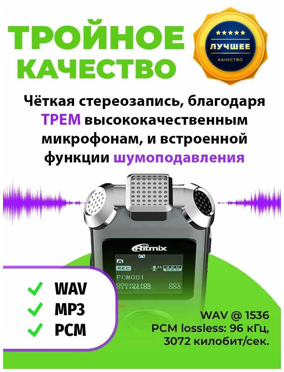 Бюджетные конкуренты (Sony ICD-UX560, Olympus WS-853): Модели Sony/Olympus отличаются мгновенным стартом записи (0.5 сек), экранированным корпусом и корректной работой с SDXC-картами. Их микрофоны сохраняют разборчивость на 3-4 метрах, но стоят на 40-60% дороже. Ritmix предлагает более богатую комплектацию (адаптеры, гарнитура) при схожем качестве звука вблизи.