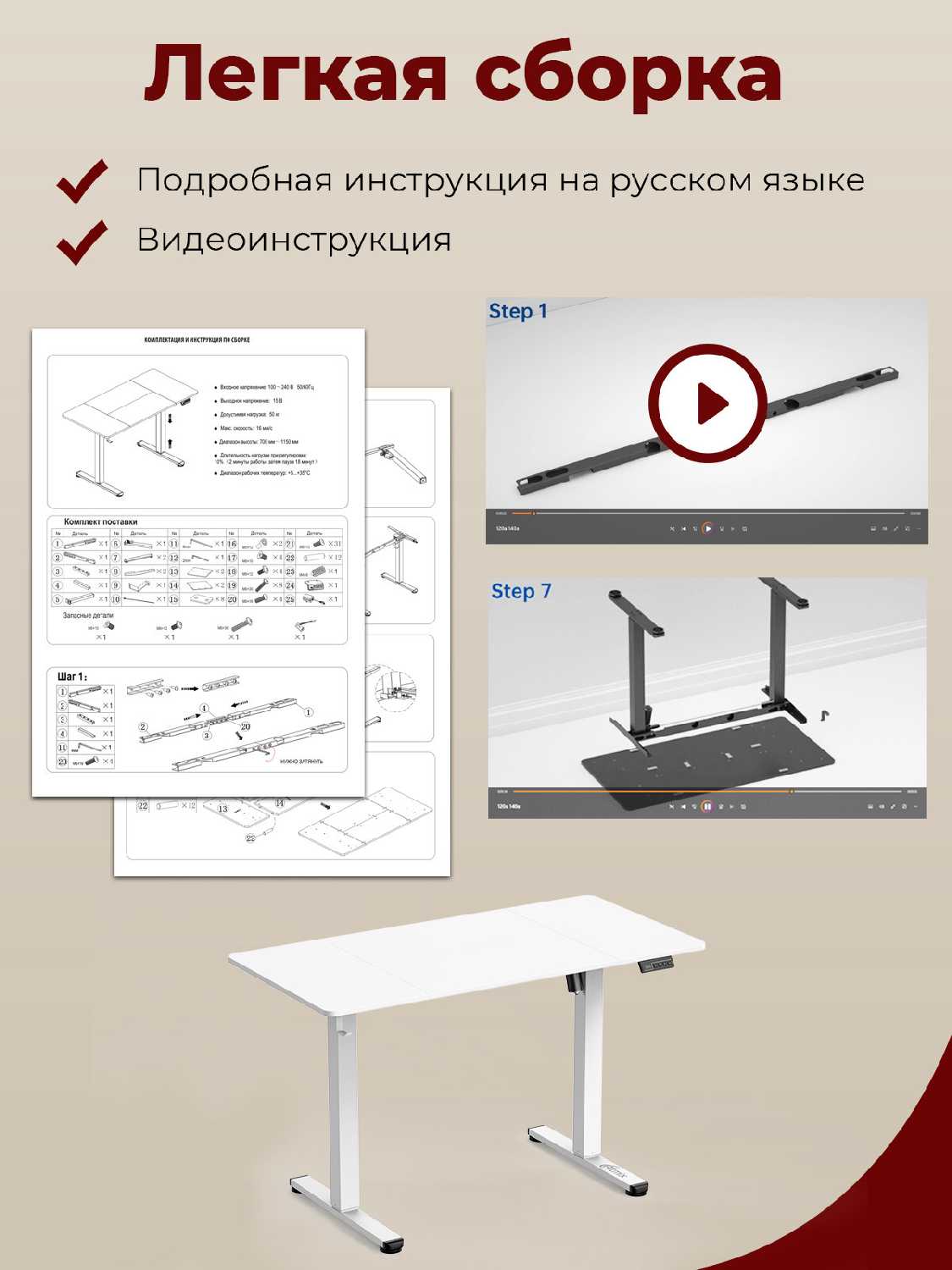 - Универсальные крепления ножек и подстолья обеспечивают совместимость с различными столешницами, повышая гибкость установки.