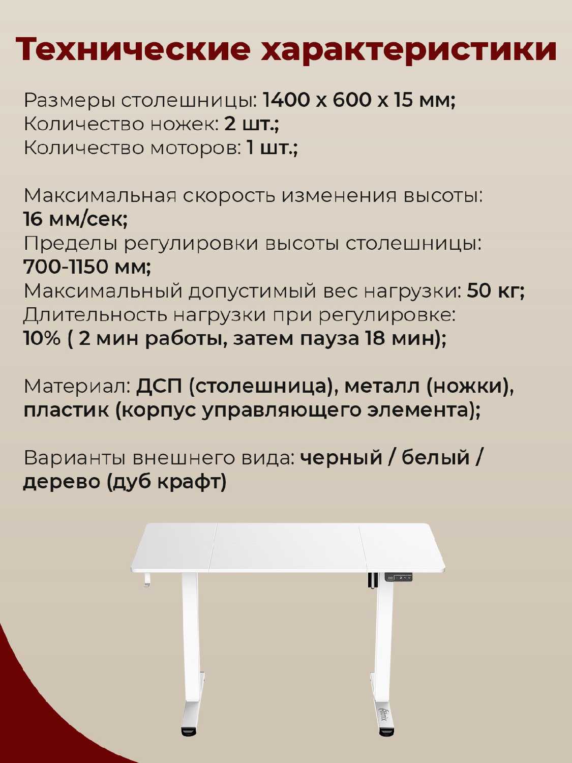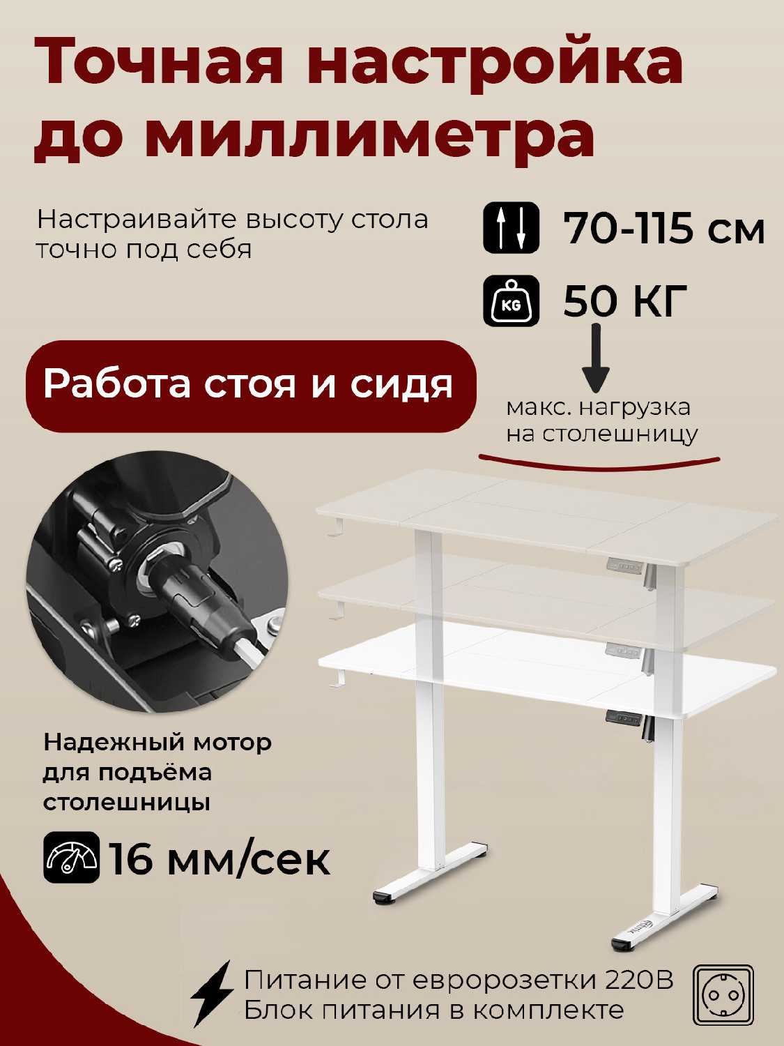- Мотор работает практически бесшумно, что обеспечивает комфорт во время регулировки высоты без отвлекающих звуков в тихой рабочей среде.