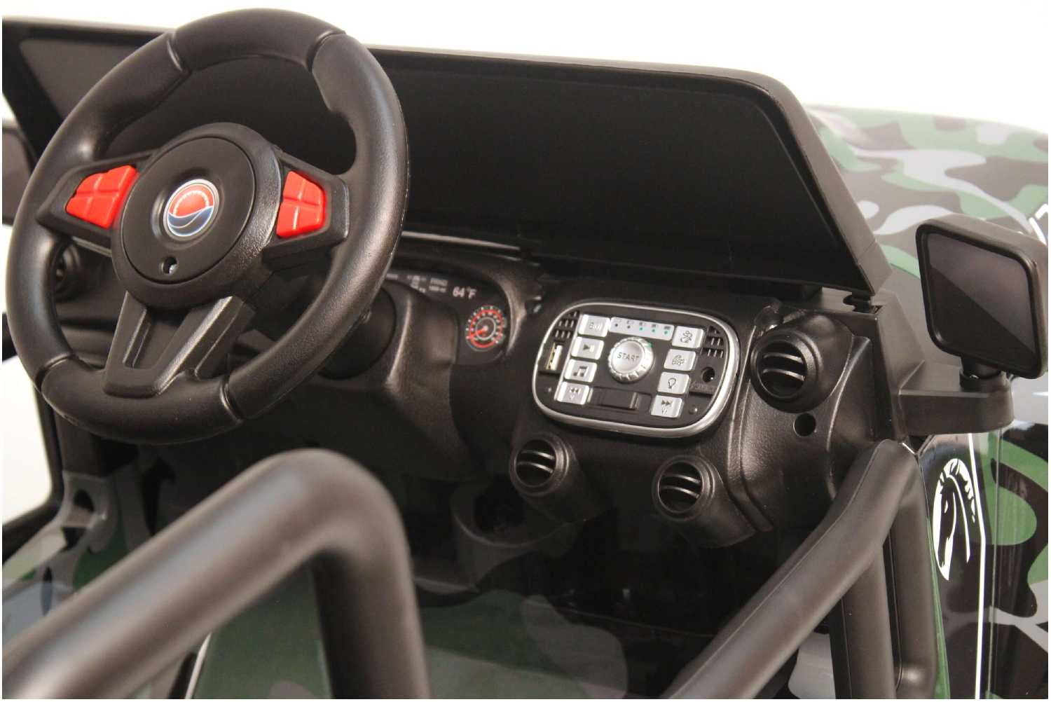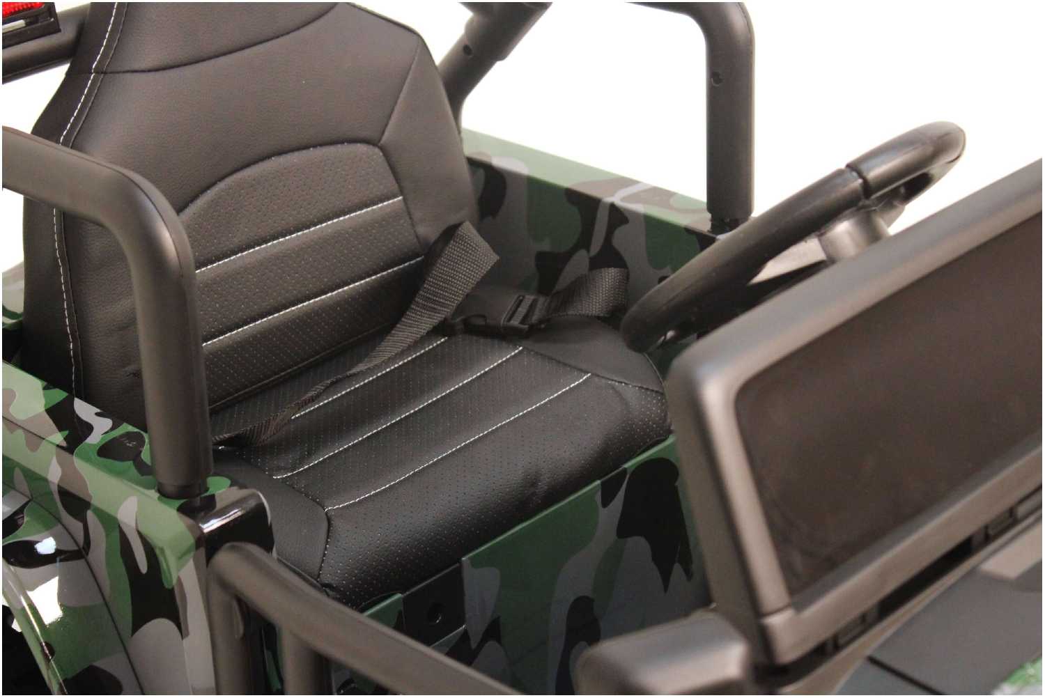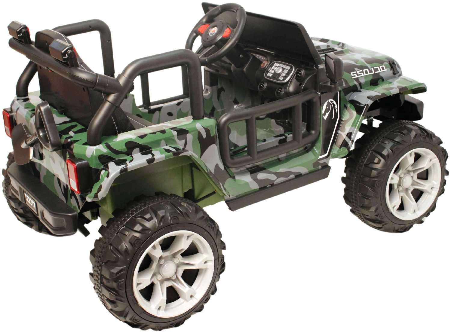 - + Лёгкая (всего около 18 кг) не тяжело выносить/заносить при прогулках. Не сложная сборка, собрал неспешно, минут за 20. Батарейка держит долго. Не бита, не крашена! ) Выглядит очень круто! Прям настоящий военный джипяра!