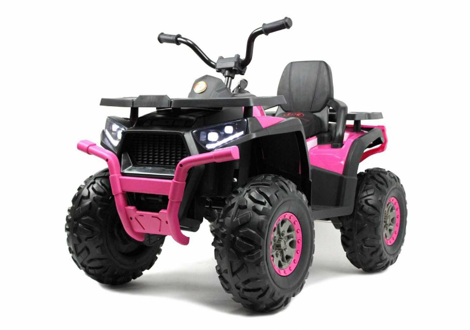 - + Отличный проходимый квадроцикл. Лужи, ямы, горки, песок - все как пыль под каучуковыми колесами. Хорошо, что не пластик, они довольно упругие. Красивый. Долго держит заряд - точно более полутора часов. Аккумулятор мощный 12 V , тогда как в аналогах обычно 8. Заводится ключом и это тоже здорово. Ребенку 5, думаю, до 8 лет будет помещаться и гонять на даче на нем свободно. Быстрая доставка.