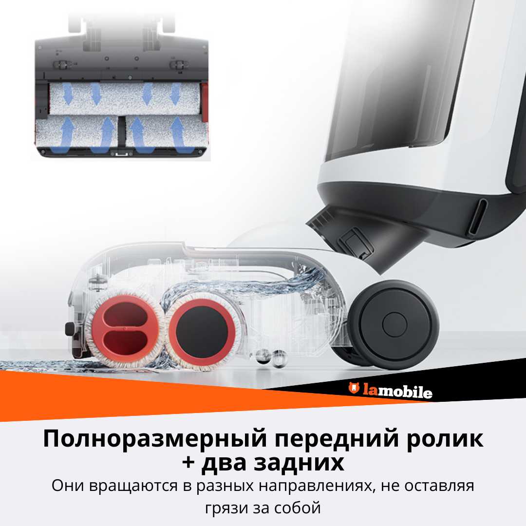 Три вращающихся валика обеспечивают движение пылесоса «вперед-назад» без размазывания грязи. Система раздельных контейнеров для чистой и грязной воды предотвращает смешивание жидкостей. Датчик загрязнения сигнализирует о необходимости повторной обработки участка. -