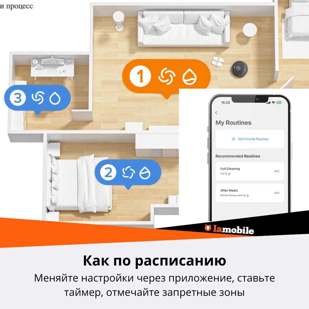 Приложение (доступно на русском) позволяет строить виртуальные стены, делить квартиру на зоны, сохранять несколько планов этажей. Пользователи особенно ценят функцию точечной уборки: например, можно запустить влажное протирание только на кухне после готовки, не затрагивая другие комнаты. -
