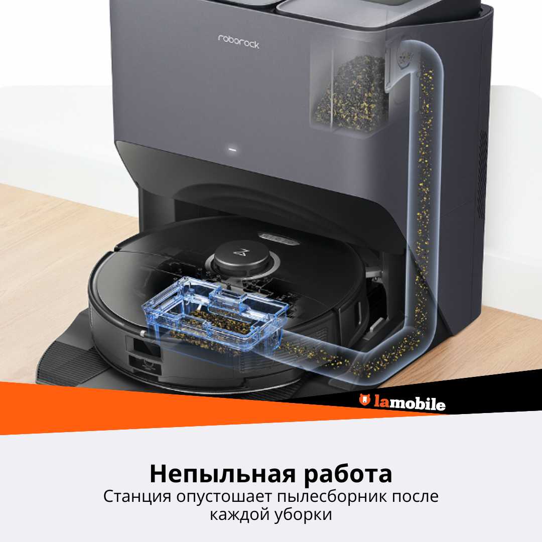 - Станция автоматически опустошает пылесборник, промывает и сушит тряпку (до 2,5 часов сушки), что минимизирует участие пользователя.