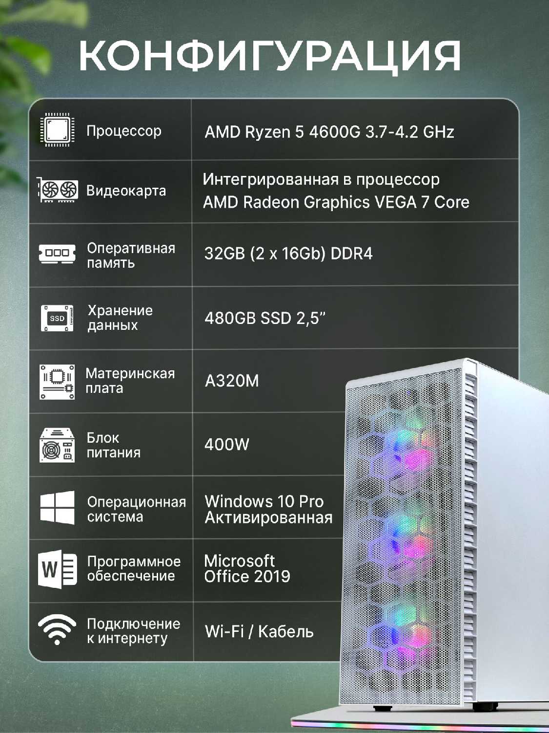 Ключевые компоненты: процессор AMD Ryzen 5 (до 4.2 ГГц), 16 ГБ ОЗУ (расширяется до 64 ГБ), SSD на 480 ГБ для быстрой загрузки ОС. Эти параметры обеспечивают быструю обработку данных, многозадачность и плавную работу в AutoCAD и других ресурсоемких программах. -