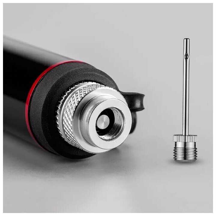 Стандартная комплектация включает иглу для мячей, пластиковую насадку и гибкий шланг с резьбовым соединением. Игла функциональна для спортивного инвентаря, но отсутствие дополнительных переходников для специфичных ниппелей (например, глубоко утопленных) ограничивает универсальность. Шланг не отсоединяется от корпуса, что усложняет замену или хранение. -