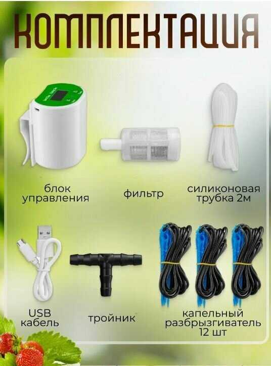 Комплектация : | 1х таймер водяного насоса 1х шланг (2м) 12х капельница для полива 2х трехстороннее соединение коннектор 1х фильтр для воды 1х USB кабель для зарядки и руководство пользователя |