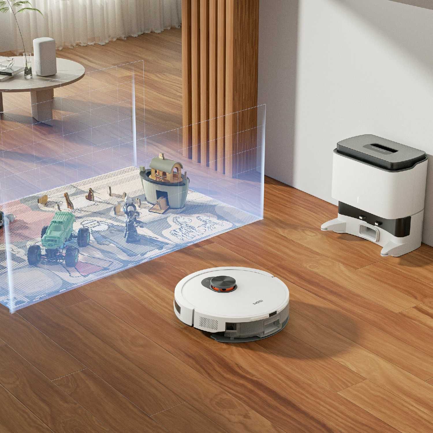 Ориентируется в пространстве на голову выше прошлого робота. - - База отрабатывает каждый раз, когда робот возвращается. Даже если пропылесосил 1 квадратный метр. Или вы отменили уборку, и он вообще не пропылесосил ничего - база будет очищать контейнер робота и шуметь.