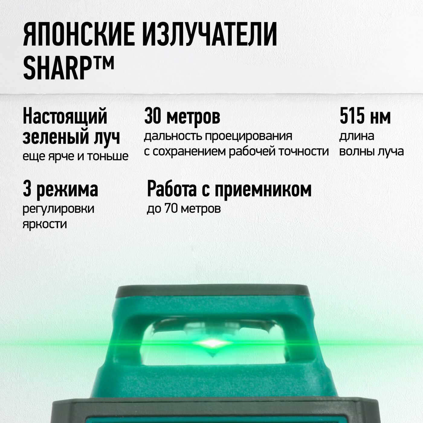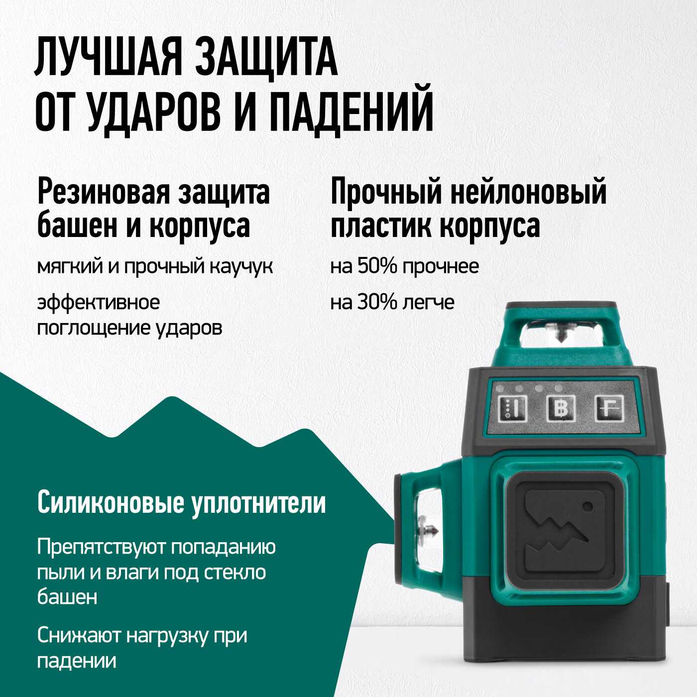 - Лазер сохраняет точность даже после падений благодаря прорезиненному корпусу и защите оптики.