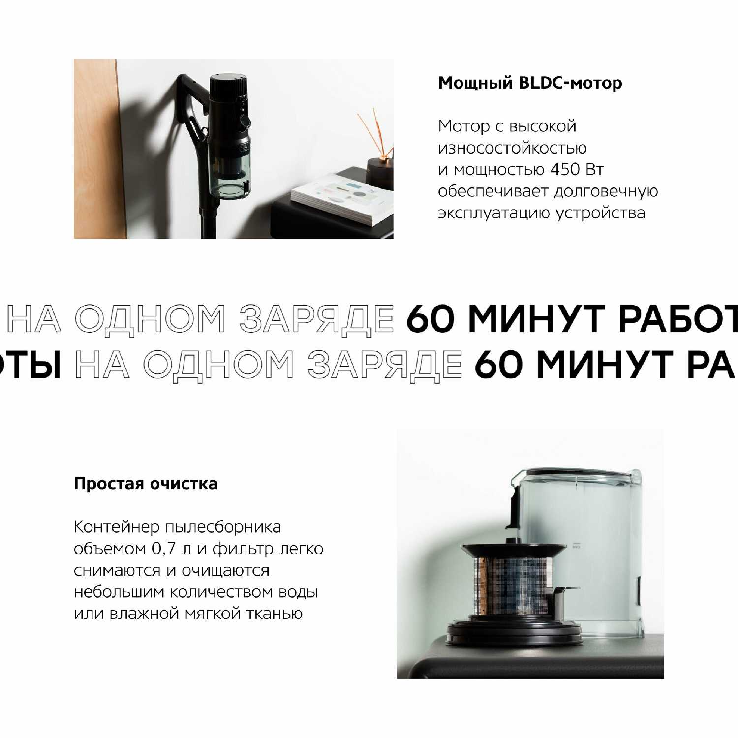 для быстрой уборки идеально. легкий и маневренный, легко передвигаться по квартире. Мощность всасывания впечатляет: легко справляется как с шерстью домашних животных, так и с мелким мусором. Батарея заряжается быстро и держит заряд достаточно долго для полноценной уборки.