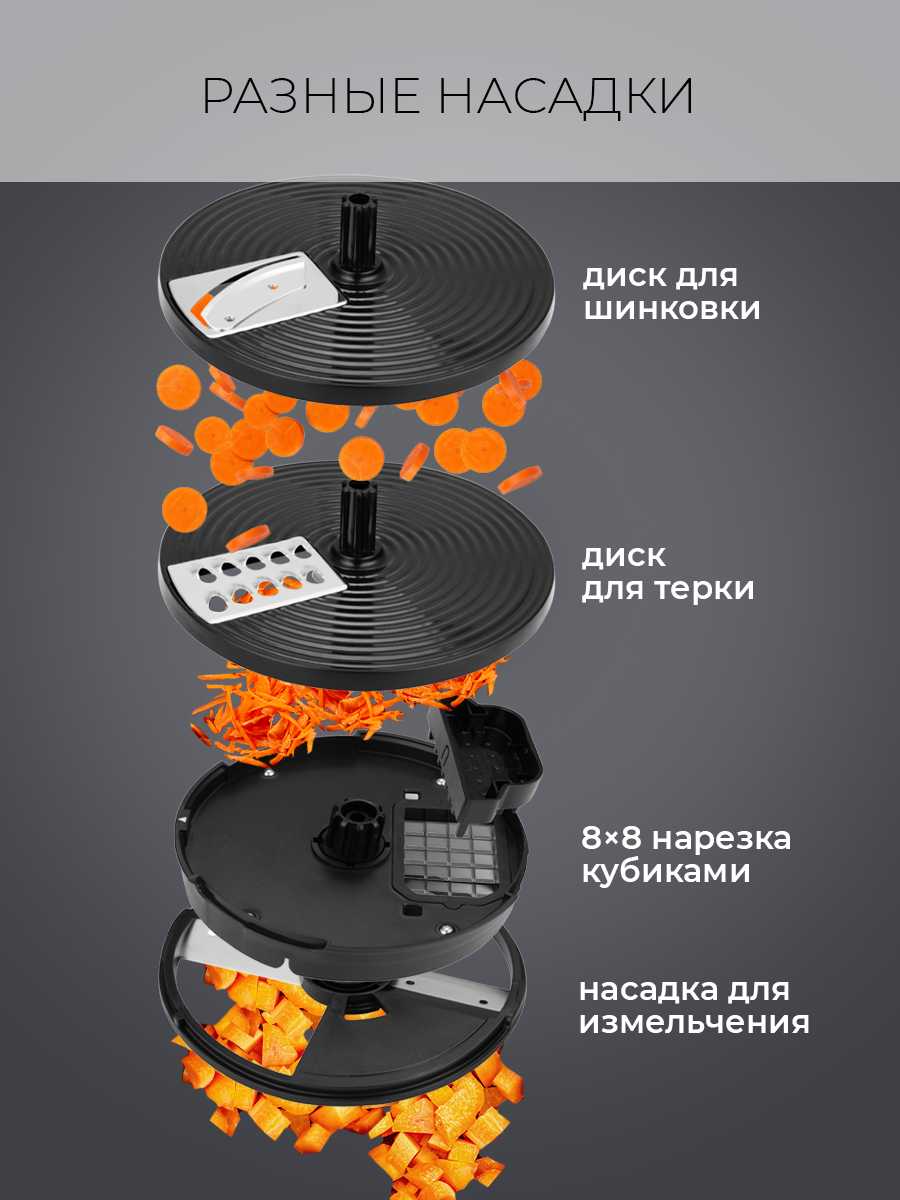 Работает намного тише предыдущего, кубикорезка и терка работают (по-крайней мере на картофеле и моркови)