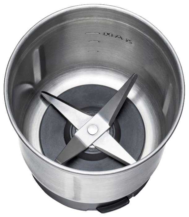 - Две чаши (одна с 2 ножами для кофе, вторая с 4 ножами для специй, орехов), удобно менять и хранить помол в герметичных контейнерах с крышками.