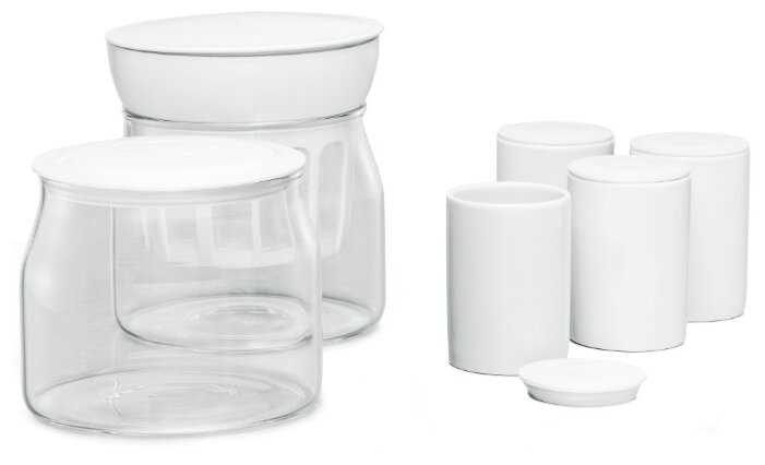 - Включает четыре керамических стаканчика по 125 мл, сито для сцеживания творога или сыра, крышки и инструкцию с рецептами, что делает набор полным и гигиеничным.