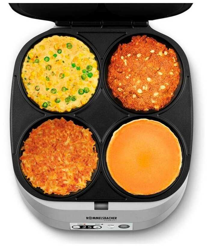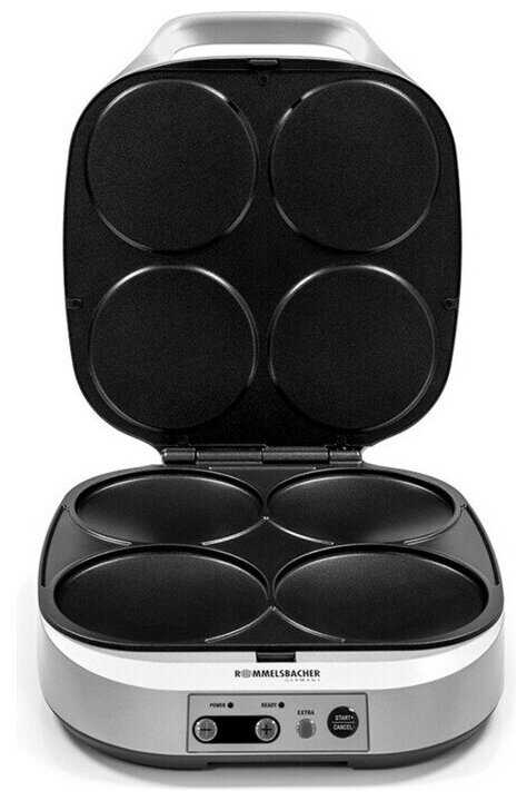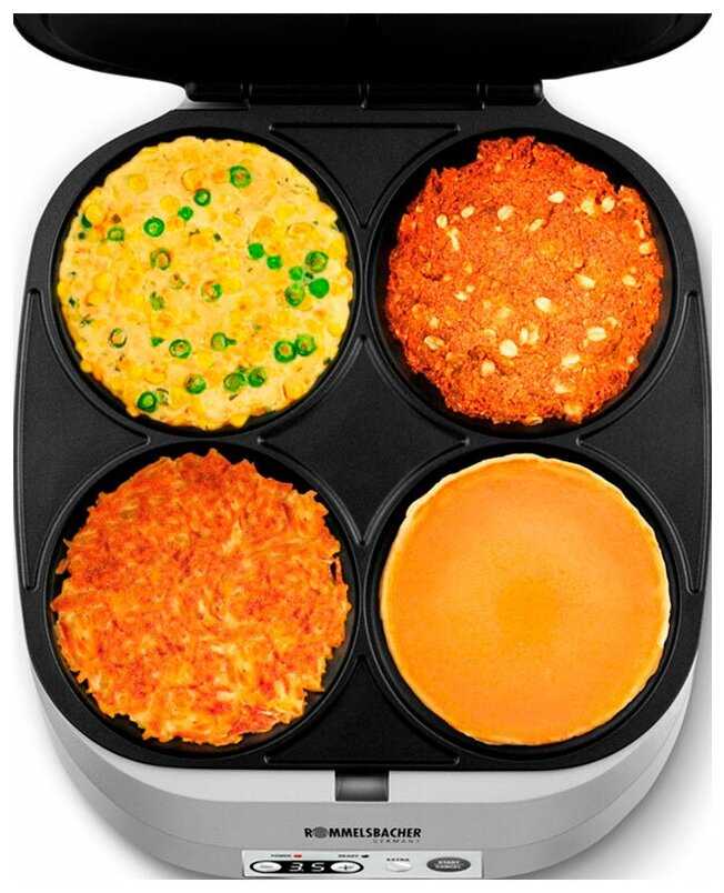 - + Очень быстро печёт, поскольку горячая поверхность и сверху и снизу. В среднем 3 минуты и оладьи готовы.