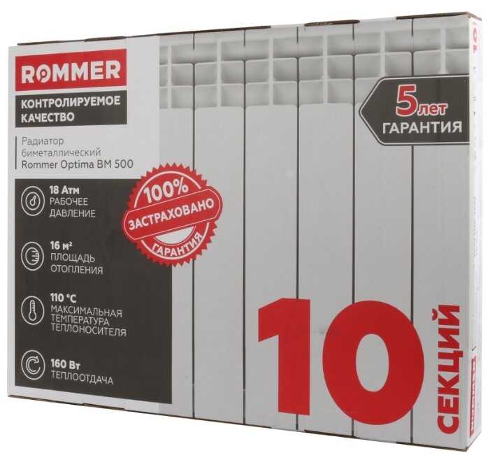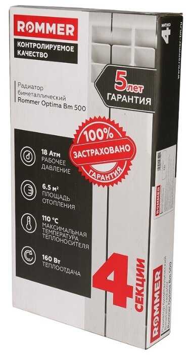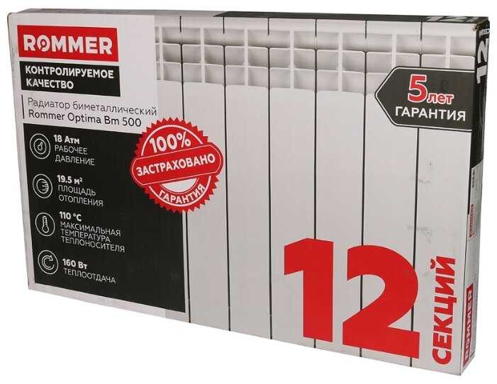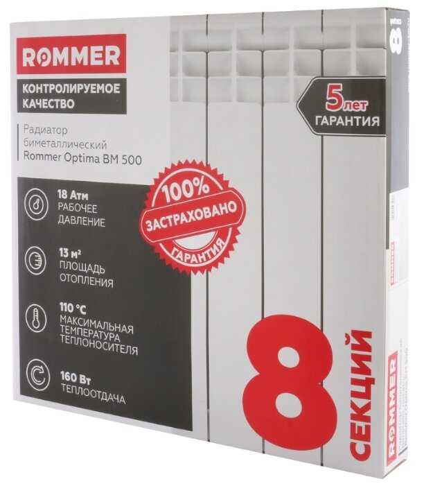 Радиатор Rommer Optima BM 500 из 8-ми секций установил перед началом отопительного сезона в детской. Хочу сказать, что радиатор оправдал наши ожидания, комнату в холодный сезон прогревал отлично, к тому же украсил собой интерьер. Выбирая систему я обращал внимание прежде всего на максимальное рабочее давление (здесь 18 бар). Срок службы биметаллических радиаторов не меньше 25 лет, надеемся, что Rommer Optima прослужит нам долго.