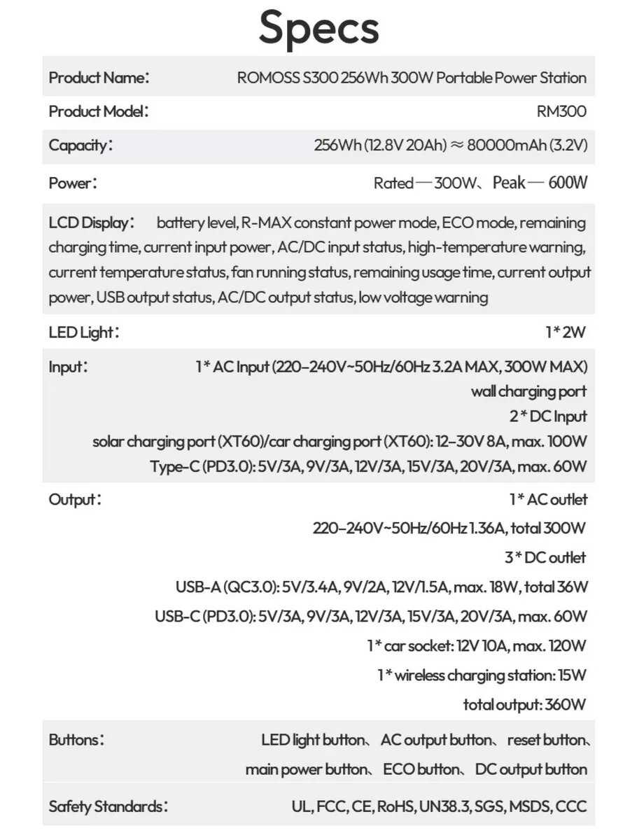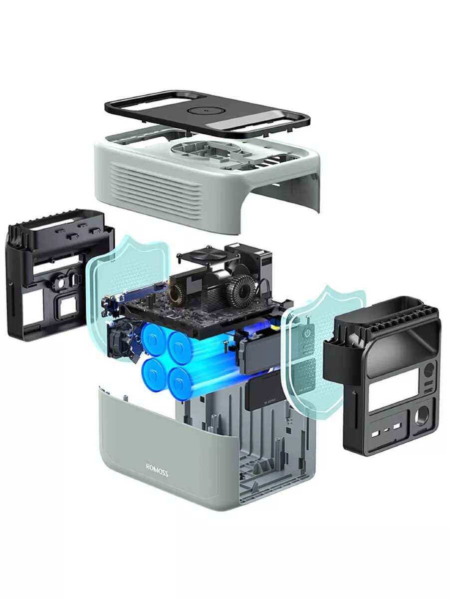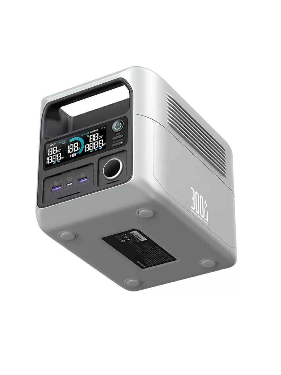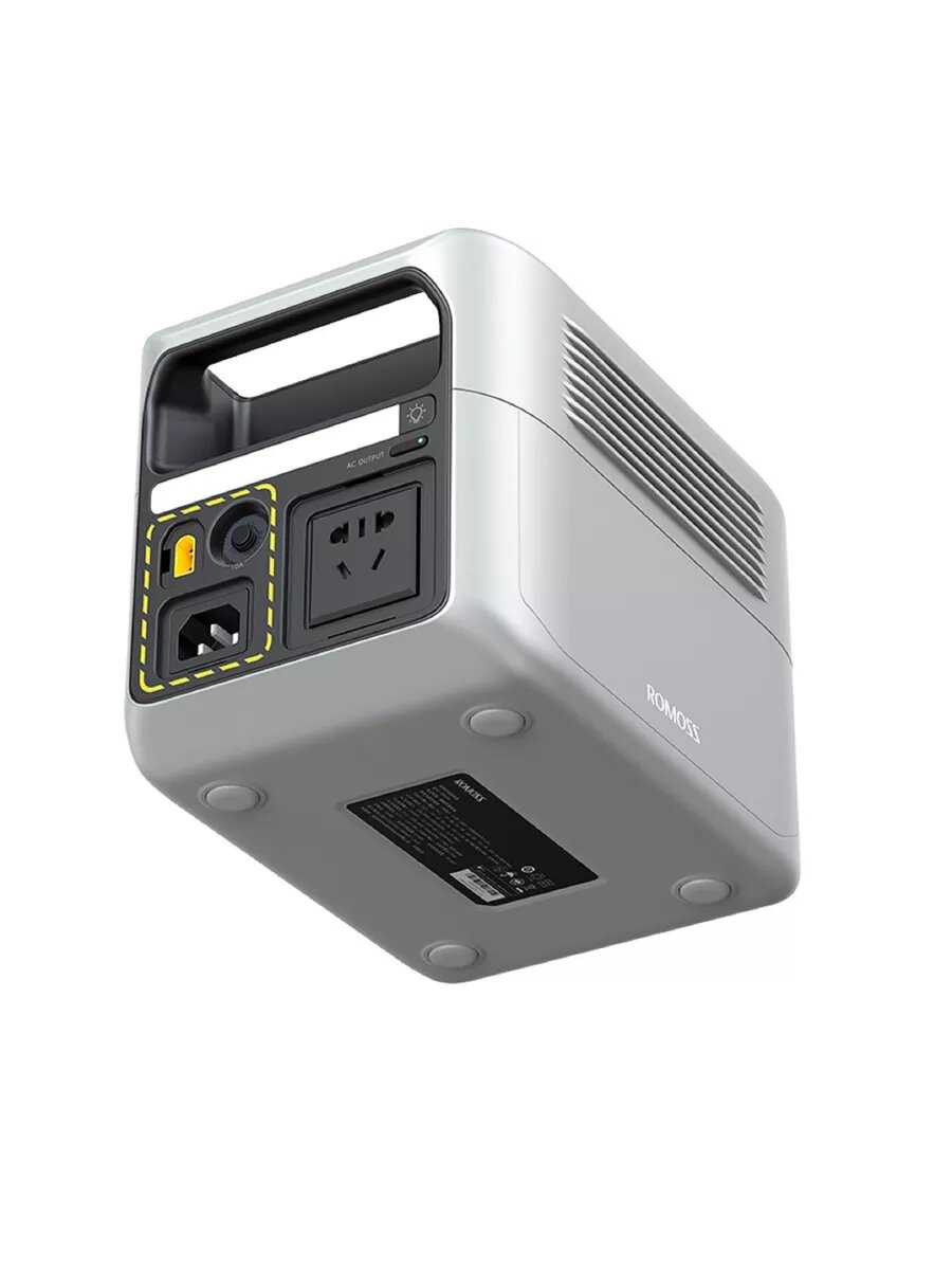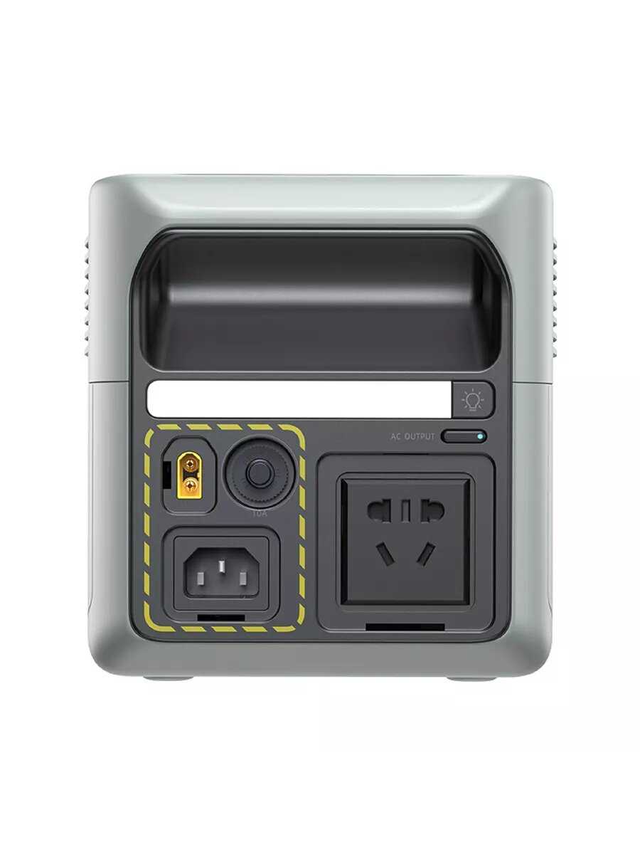 Станция имеет прочный пластиковый корпус с удобной ручкой для переноски. В комплекте поставляется сама станция, сетевой кабель для зарядки и кабель от прикуривателя автомобиля. На передней панели расположены две розетки 220 В, порты USB-A и USB-C с поддержкой быстрой зарядки, порты 12 В и разъём для солнечных панелей. Защитных заглушек на порты не предусмотрено. -