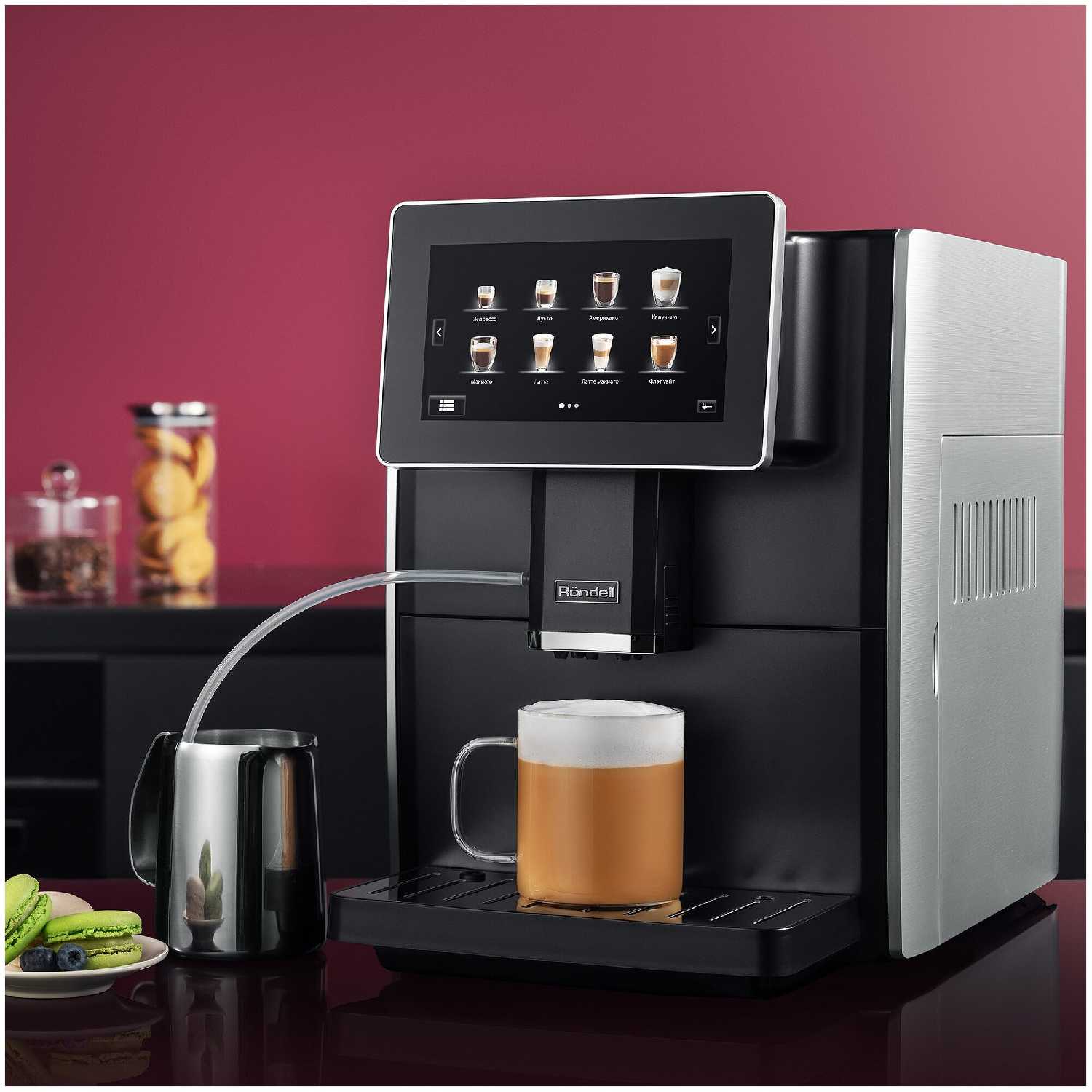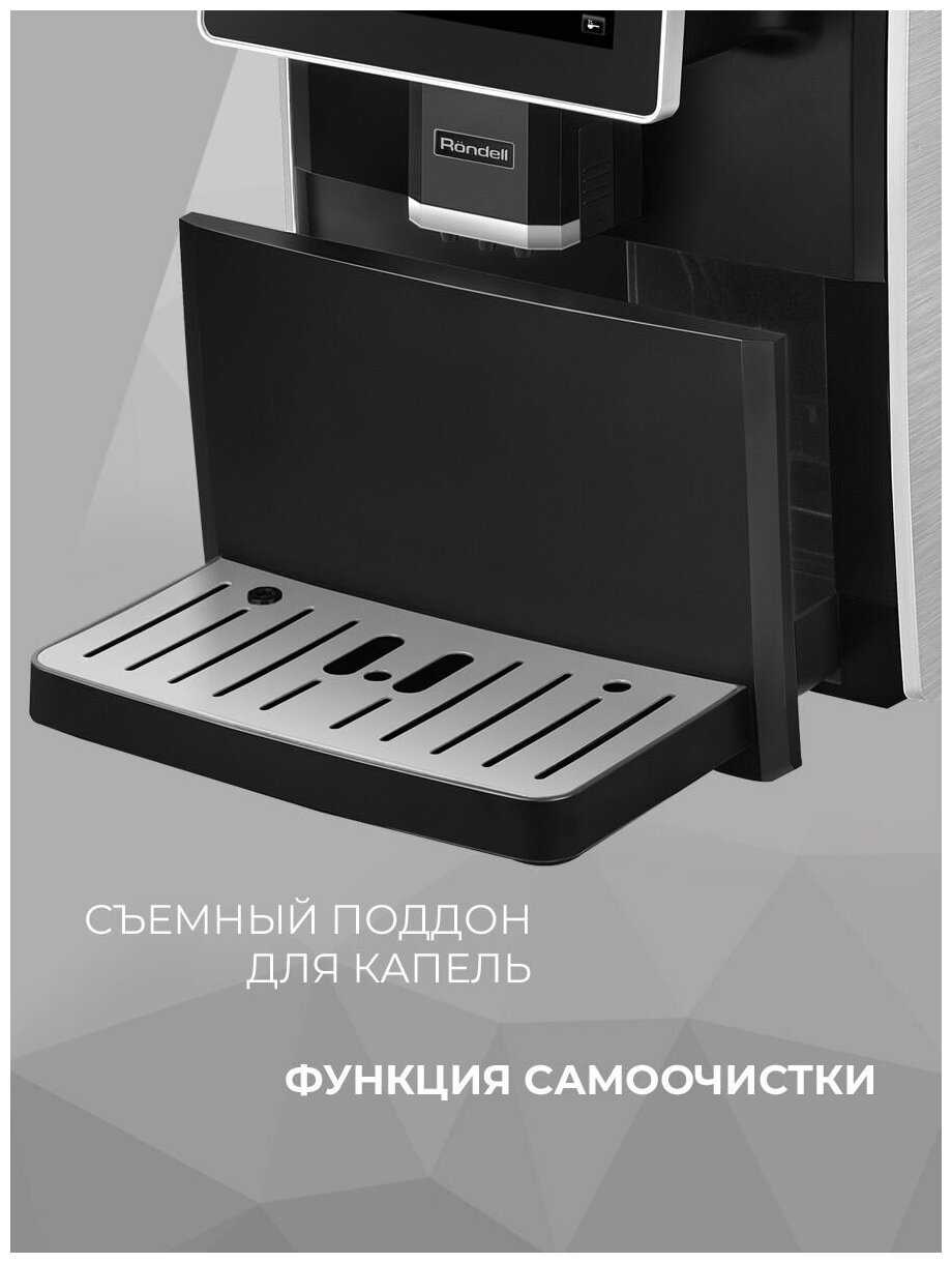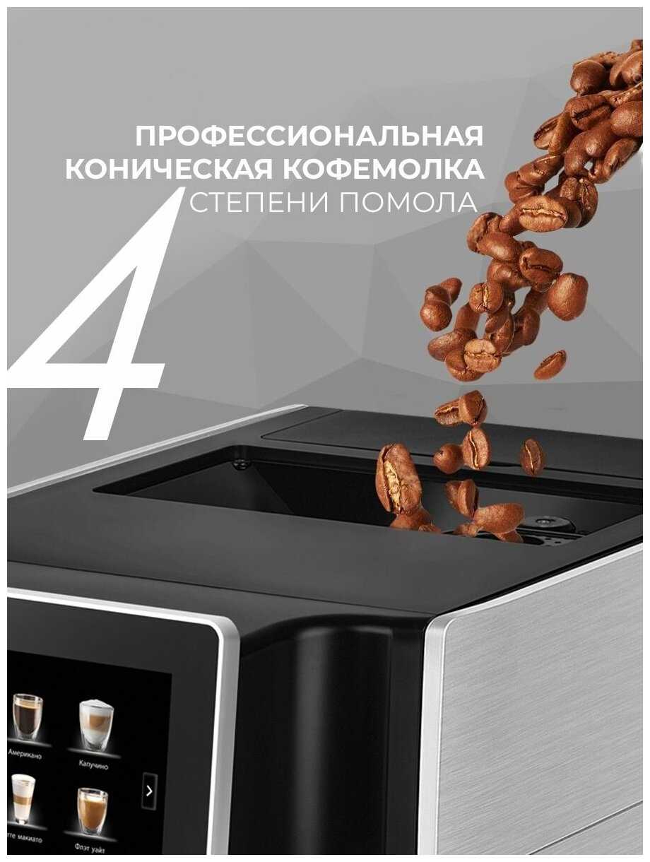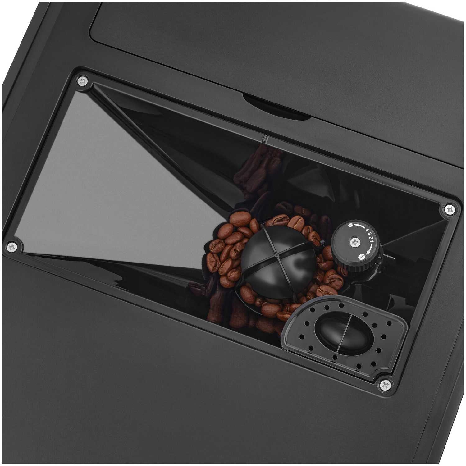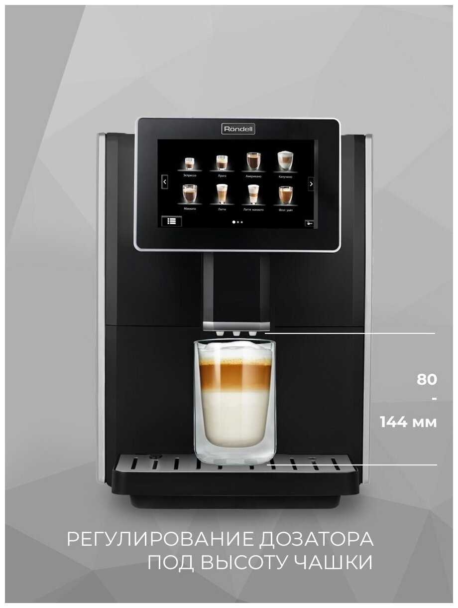 длина шнура 1.5 м, регулировка дозатора под высоту чашки 80-144 мм, автоматическая очистка системы молочной пены, жернова из нержавеющей стали