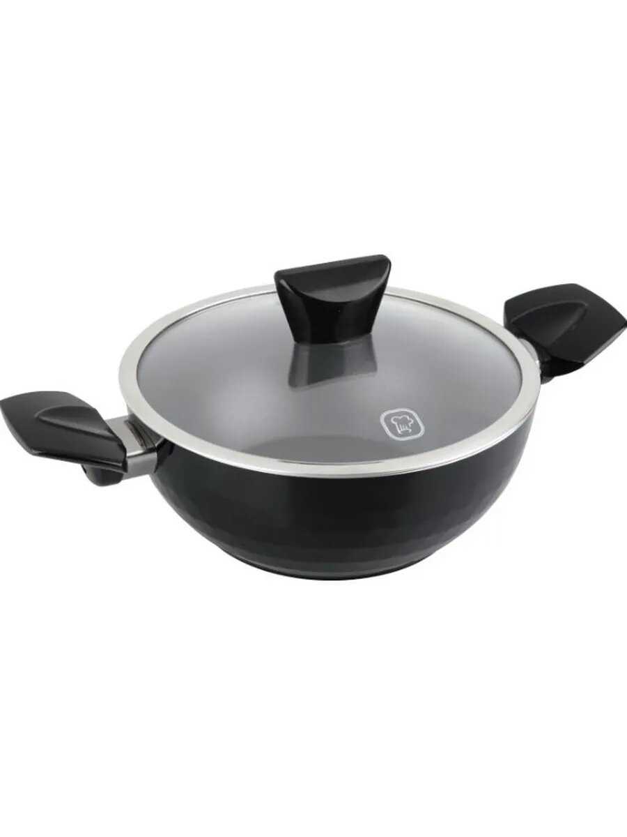 - + Качественное антипригарное покрытие, толстые стенки, удобные ручки.