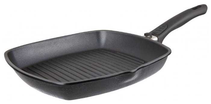 - Форма сковороды (28×28 см) и высокие бортики (2.5 см) позволяют готовить большие порции без разбрызгивания.