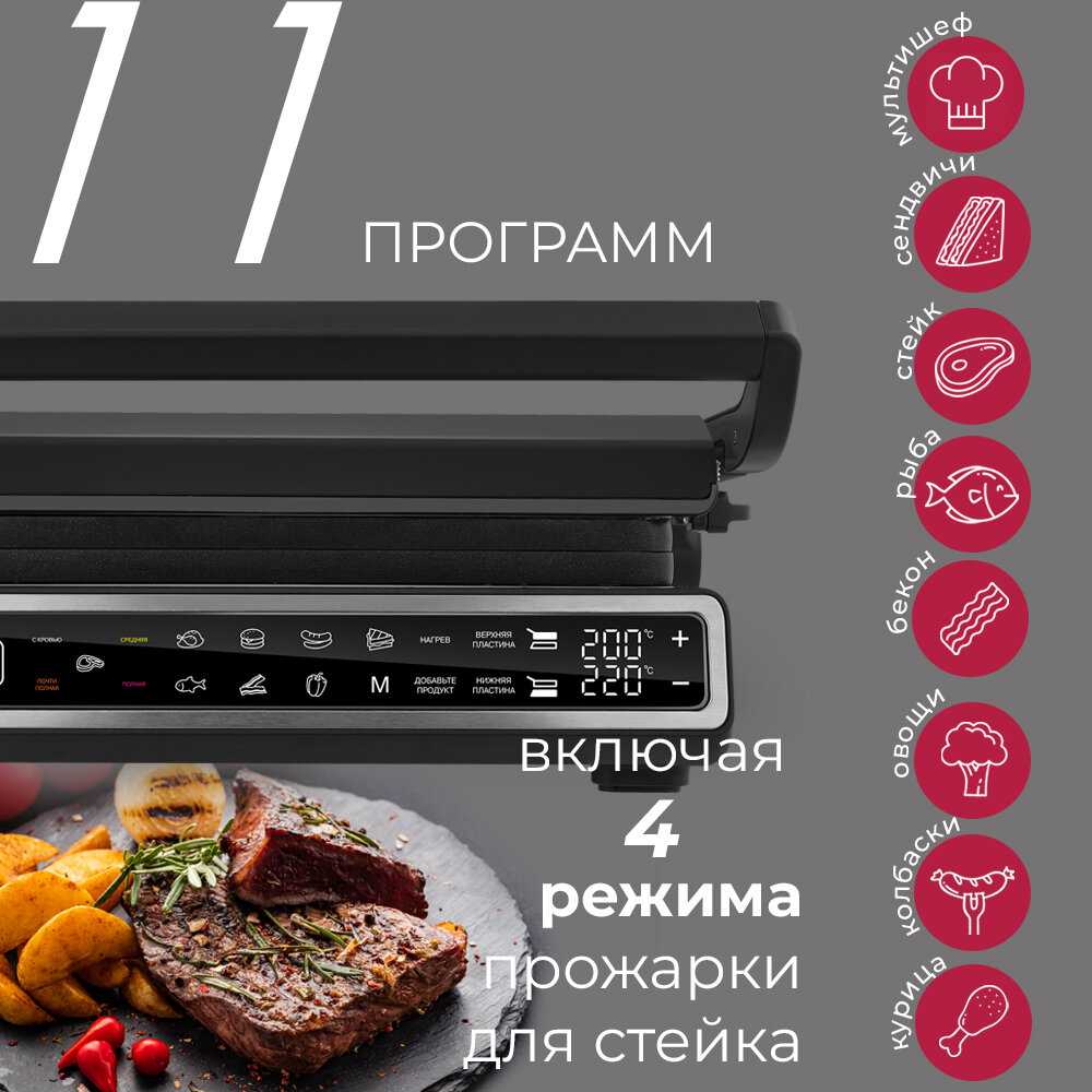- + Современная модель с сенсорным управлением, пластины с антипригарным покрытием нагреваются равномерно и главное быстро до нужной температуры, 11 режимов.