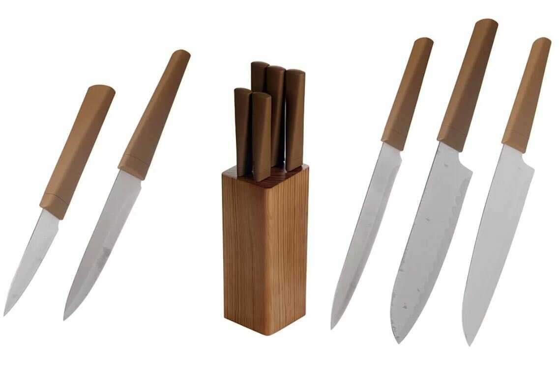 - нож для овощей 9 см, - нож универсальный 127 см, - нож сантоку 18 см, - нож разделочный 20 см, - нож поварской 20 см, - подставка. |