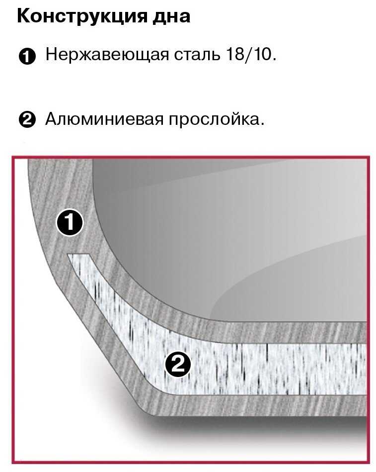 - + Корпус из нержавейки 18/10, да ещё и с зеркальной полировкой. Выглядит красиво и удобно — не пачкается, да и чистить её легко. Толщина стенок и дна в 0.6 мм и 5 мм делают кастрюлю довольно прочной, тепло распределяется равномерно, готовить в ней одно удовольствие.