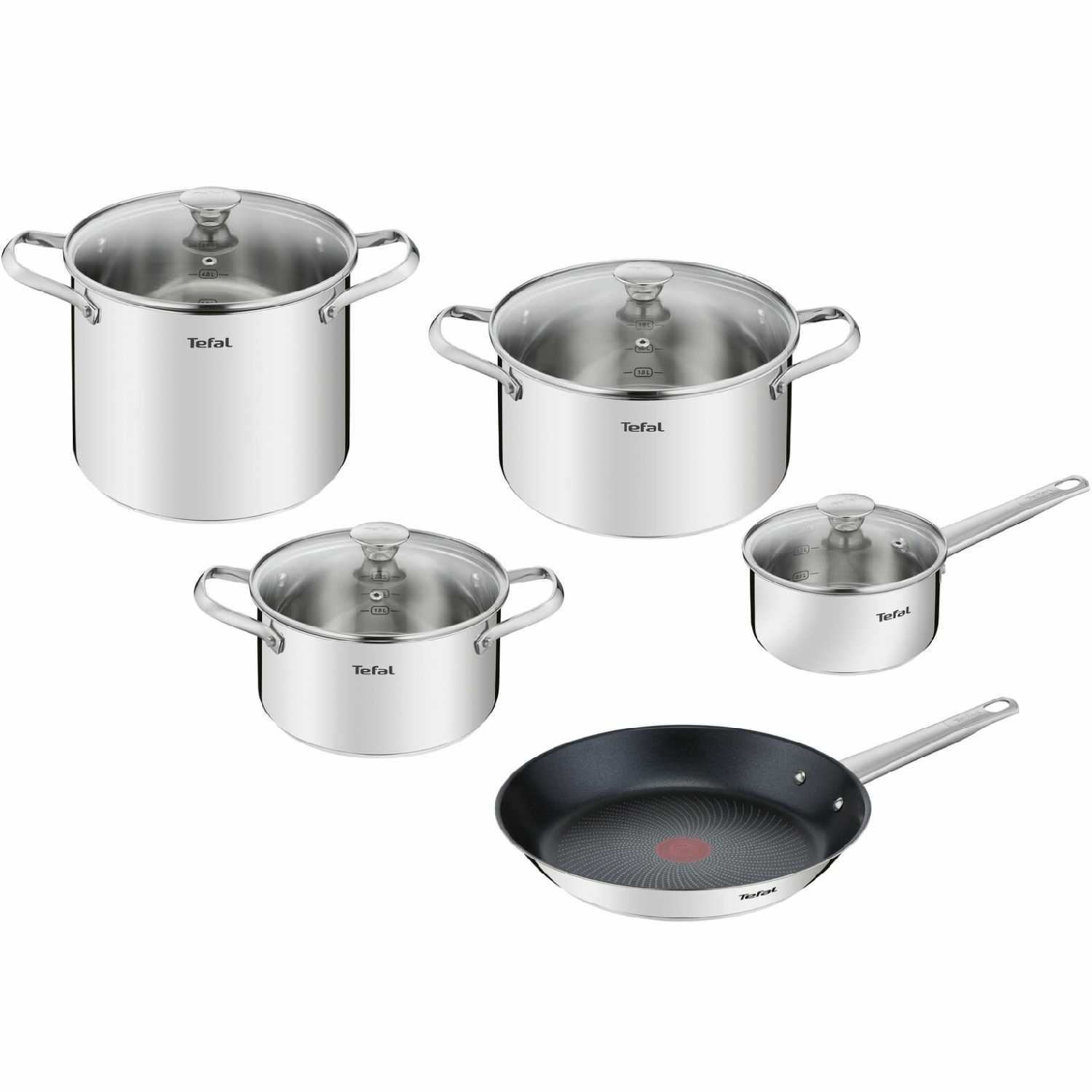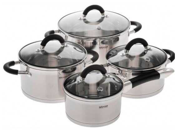 - + Кастрюли разных размеров и сковородки, удобно подбирать под порцию. Качество материалов радует, чувствуется прочность. При приготовлении еды не возникает проблем с прилипанием.
