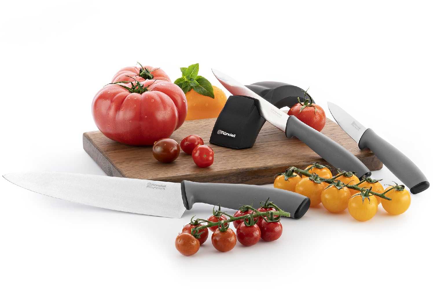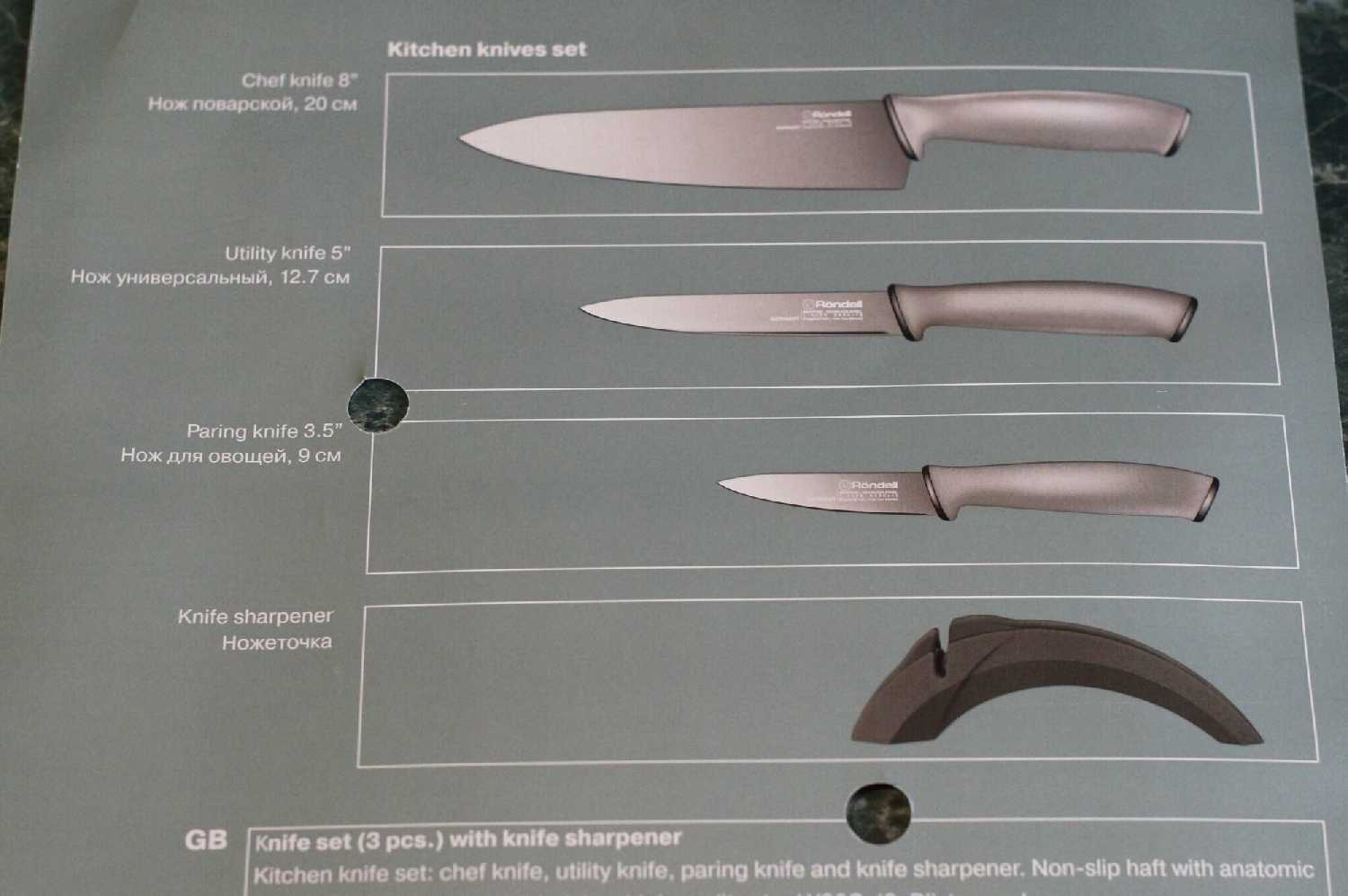 Комплектация : | точилка, нож поварской 20 см, нож универсальный 12, 7 см, нож для чистки овощей 9 см |