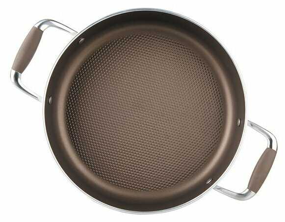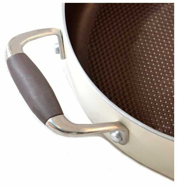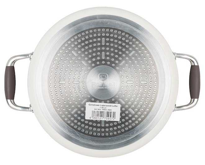 Отличный качественный сотейник. Очень красивый дизайн. Очень хорошее качественное антипригарное покрытие. Готовить в нем одно удовольствие. Ни чего ни когда не пригорает. Моется он тоже очень легко. Достаточно просто сполоснуть его водой и он как новый.