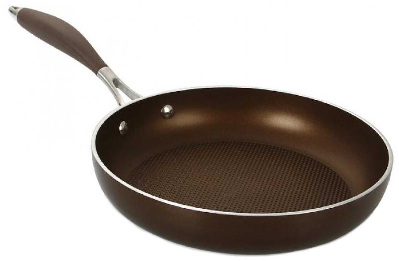 - + Материал корпуса — штампованный алюминий, что легко и долговечно. К тому же у неё три слоя антипригарного покрытия. Красивый цвет для нашей кухни. Сковорода подходит для посудомоечной машины.