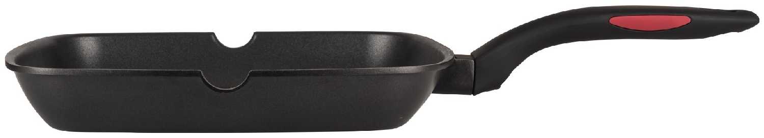 - + Сковорода достаточно толстая, прямоугольная форма вместительная, удобные носики с двух сторон для слива жира, ручка не скользит и не нагревается