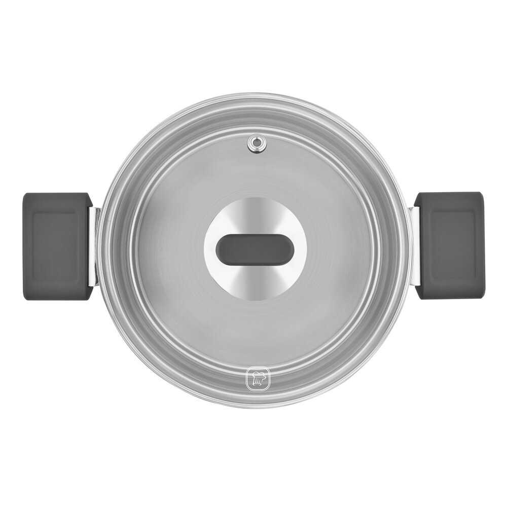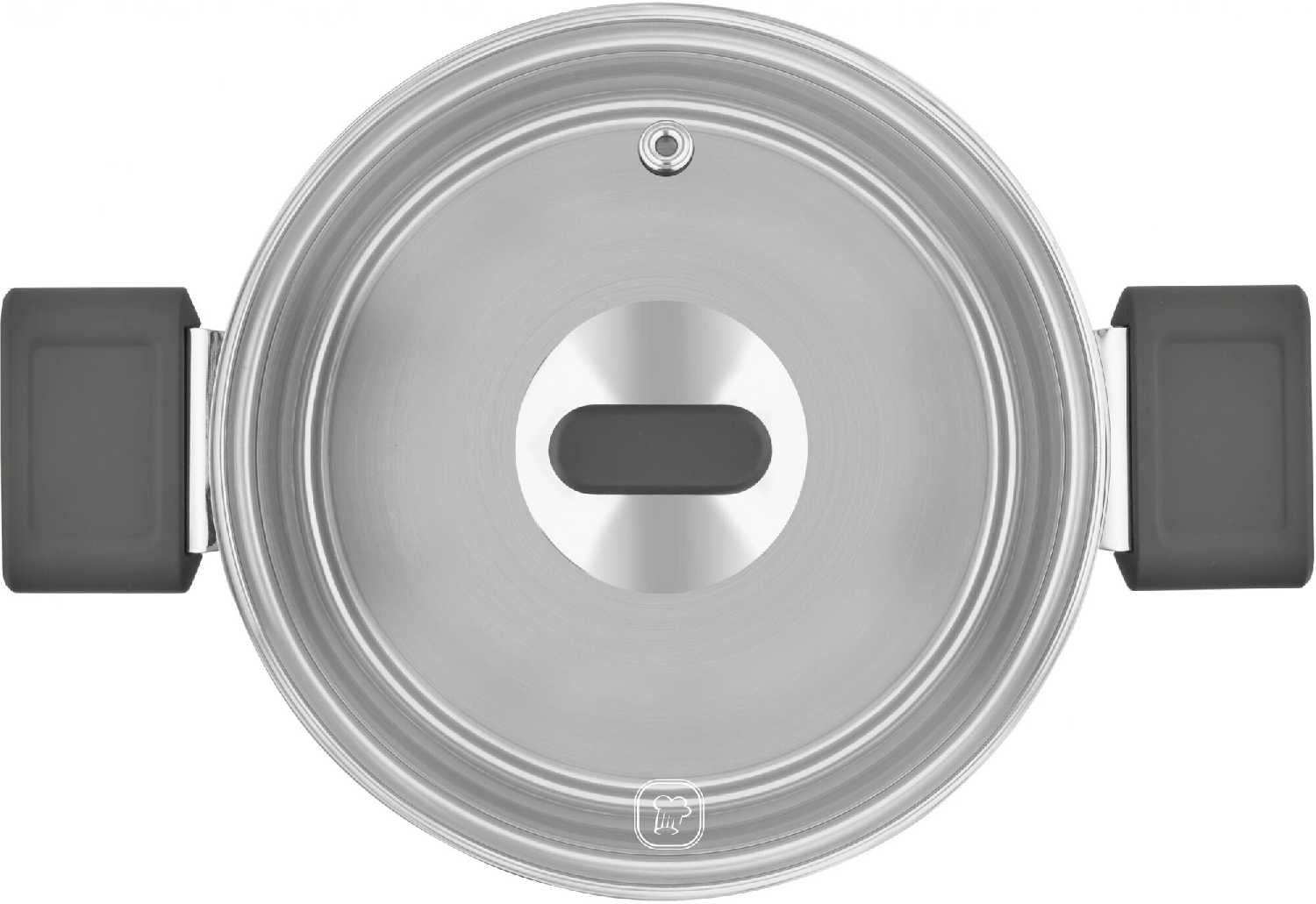 Кастрюля с крышкой. Хорошее качество корпуса, сделанное из стали. Объем 5,1 литра. Приятные ручки, если готовить на электрической или индукционной плите, то они не перегреваются. Они несъемные, поэтому в духовку не поставишь, но для больших блюд, где много ингредиентов лучше не придумаешь. На оливье можно все в одной кастрюле готовить.