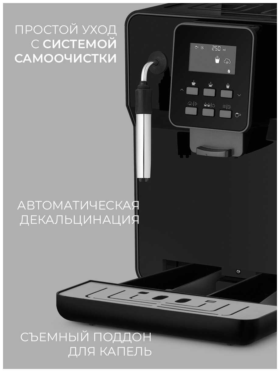 - + Удобный LED дисплей, настройка крепости кофе, регулировка температуры напитка и объема молочной пенки, выбор объема чашки, емкость для воды 1,1 литра, съемный поддон для сбора капель, автоматическая очистка от накипи.