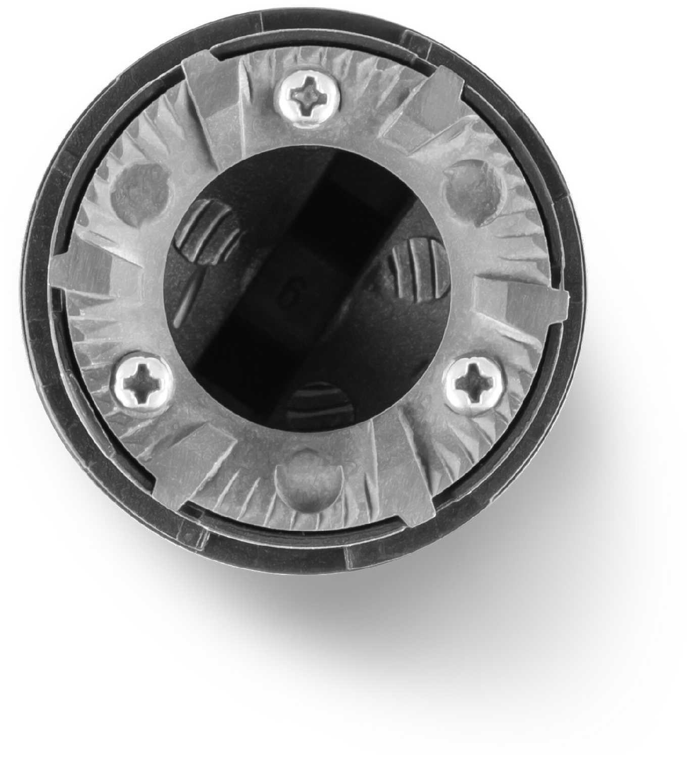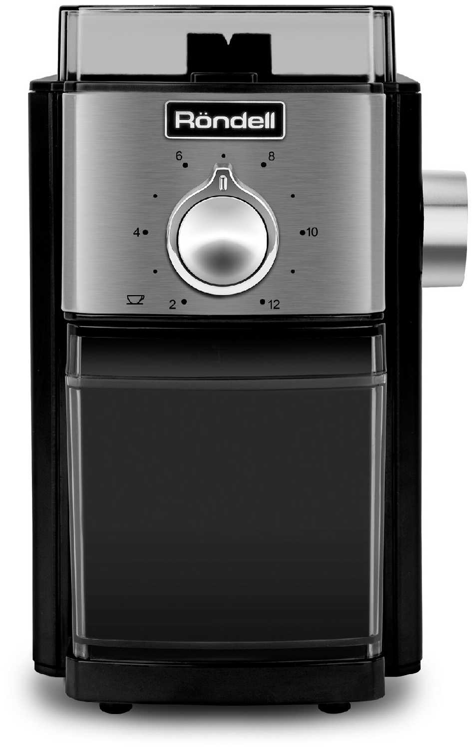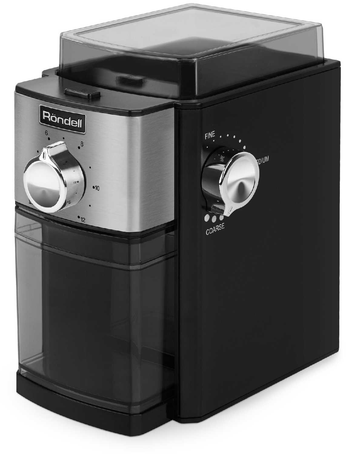 Часть корпуса с функциональными ручками выполнена из блестящей нержавеющей стали, создающий яркий контраст с черной пластиковой поверхностью кофемолки.