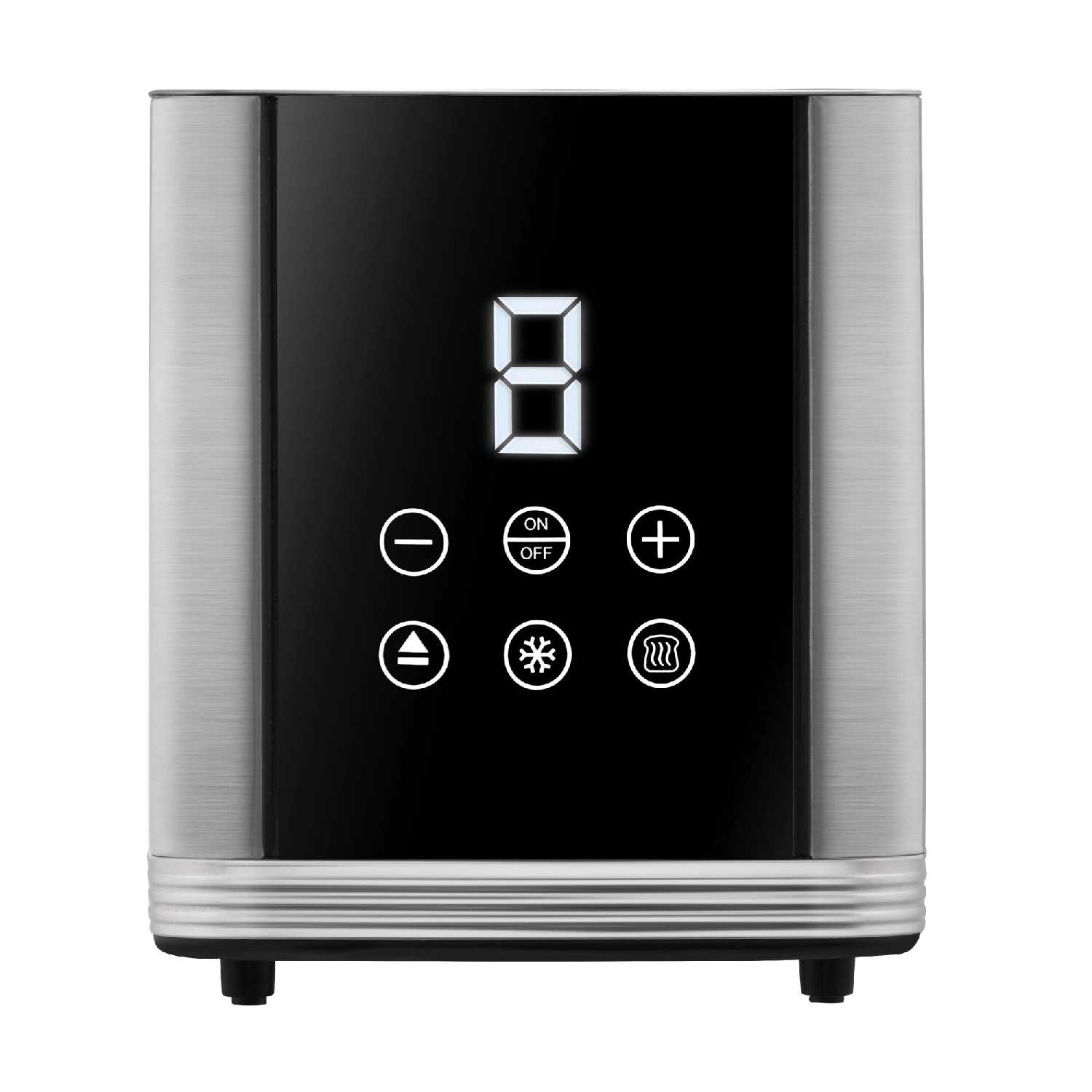 Удобно, что есть 2 отделения, помещаются и обычные тосты, и более широкие куски хлеба. Всего 6 уровней обжаривания, можно сделать на свой вкус, от слегка подрумяненных до хорошо хрустящих. Управление электронное, с дисплеем, который показывает выбранный режим и время. Выглядит аккуратно и не занимает много места