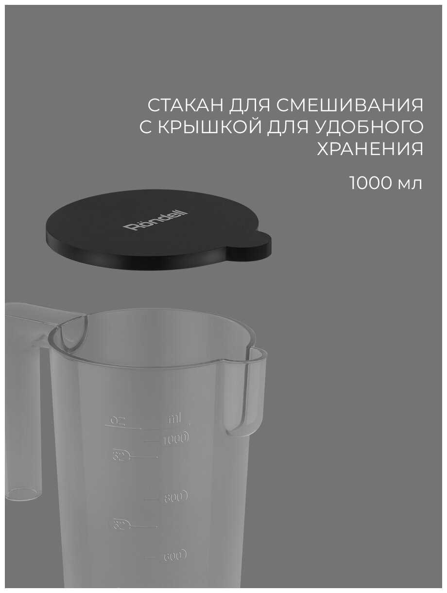 - Мерный стакан с крышкой (объем ≈600 мл) позволяет хранить готовые смеси в холодильнике без перекладывания.