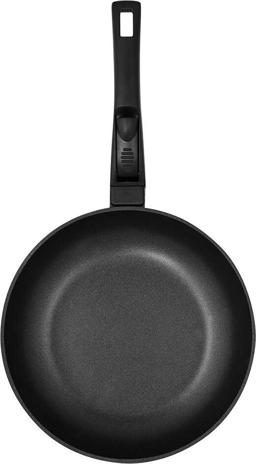 - + Одним из главных преимуществ является его универсальность. А именно возможность готовки на различных поверхностях, включая индукционную плиту. К достоинствам отнесу съёмную ручку, обеспечивающую комфорт при использовании и мытье. Она не нагревается, что снижает риск случайных ожогов.