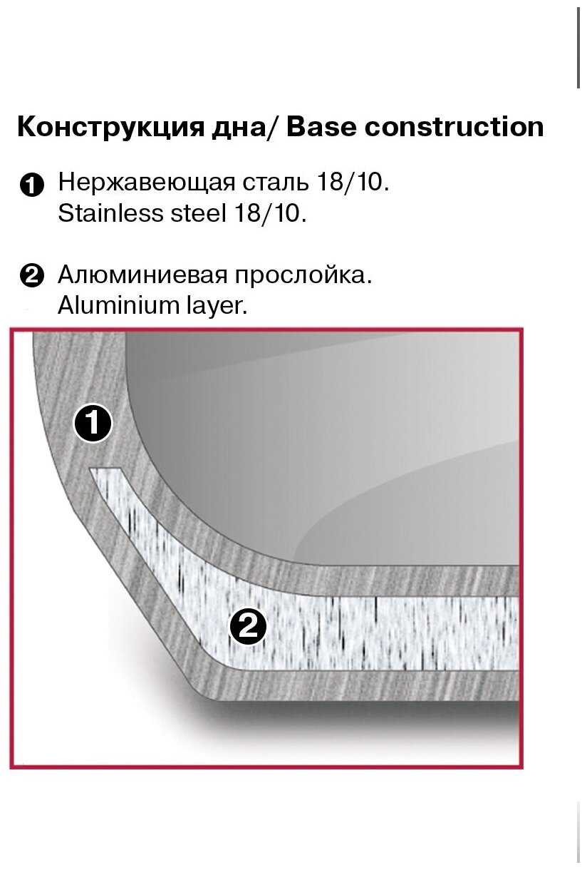 - + Дно толстое, 4 мм. Не будет деформации при длительном использовании, а значит может претендовать на долговечность. Ручки удобные, без заклепок, можно мыть в посудомоечной машине, что самый большой плюс.