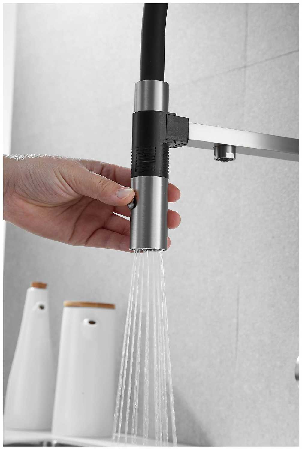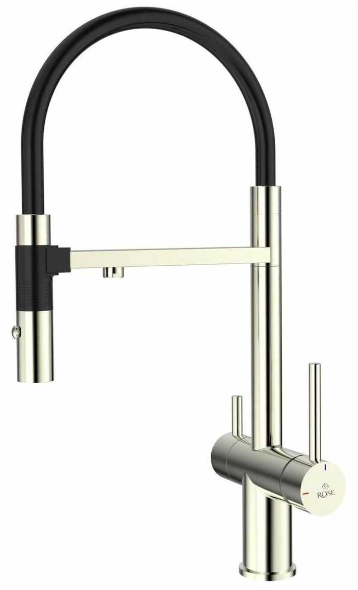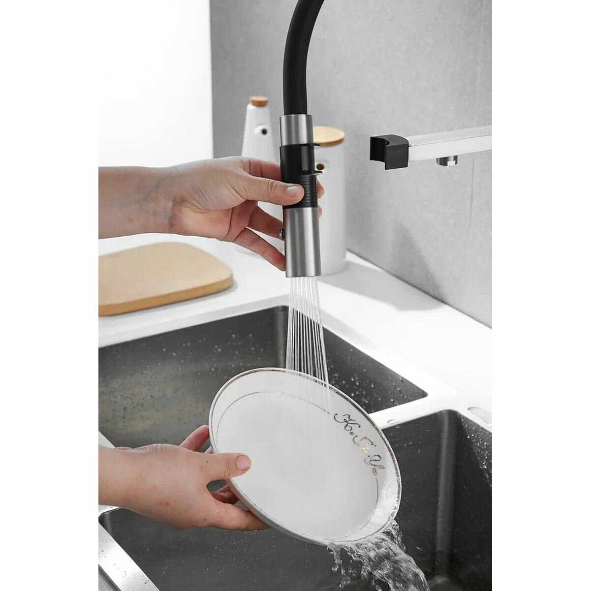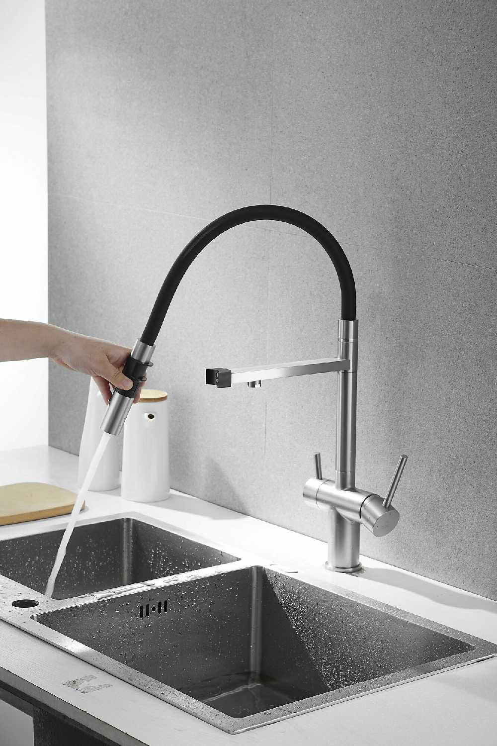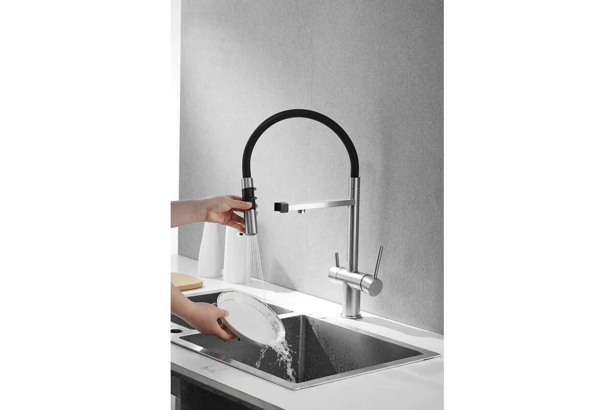 - + Это кран со встроенным краном для фильтра воды. Удобный, гнущийся шланг позволяет легко помыть продукты, посуду или саму раковину.