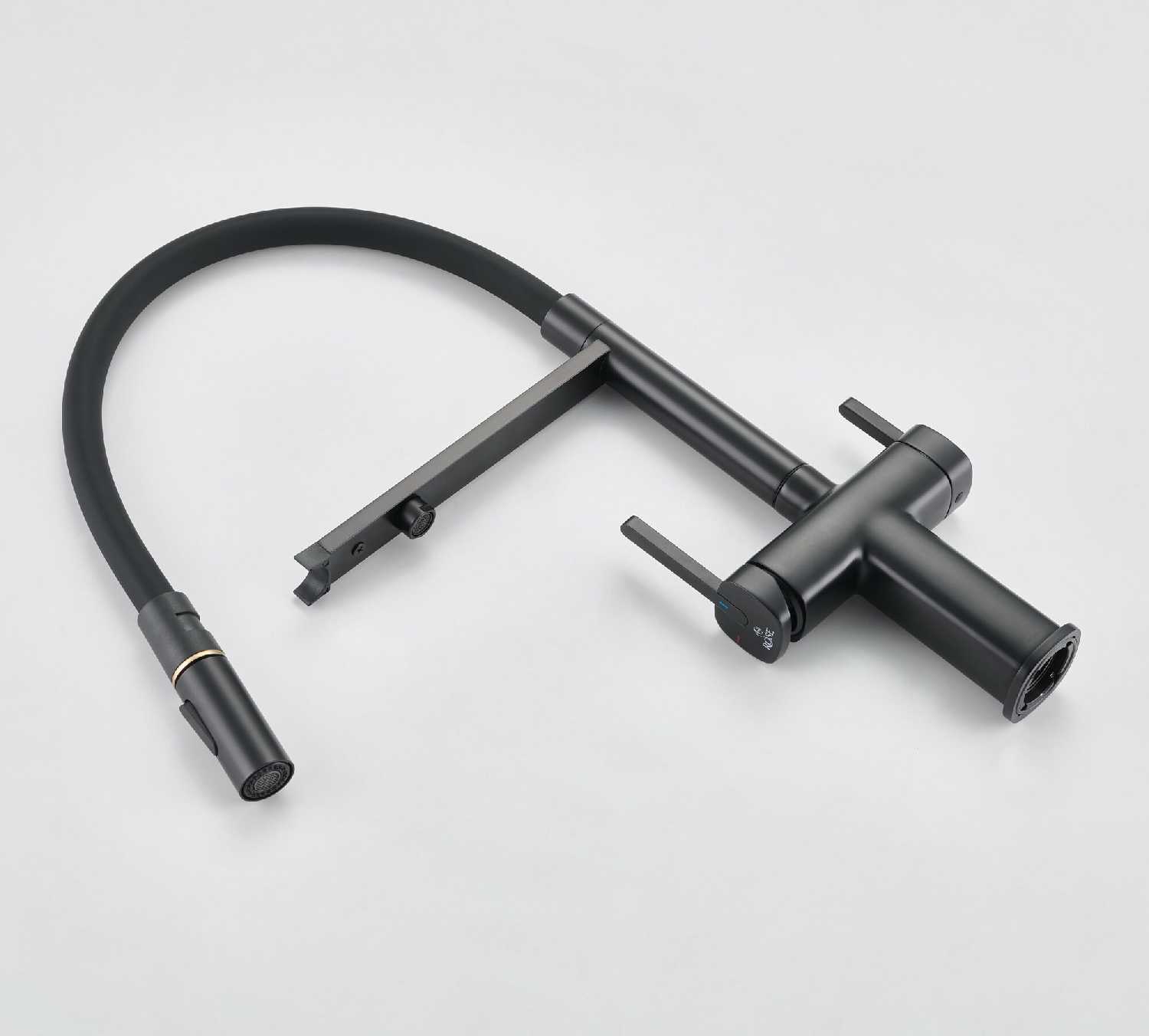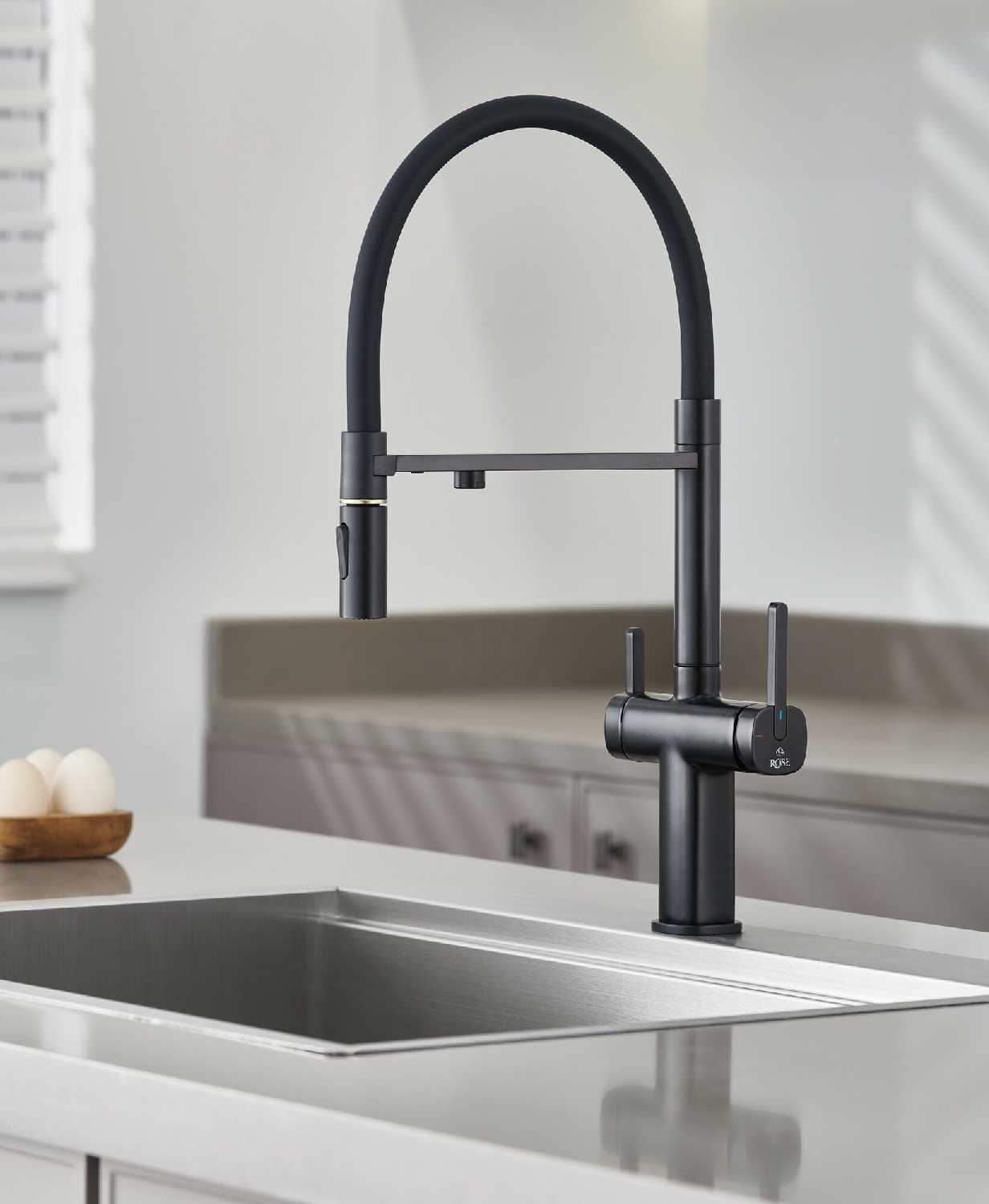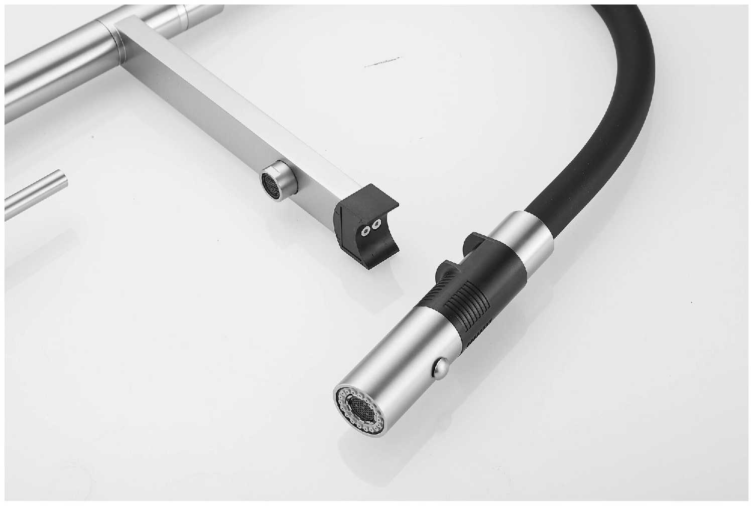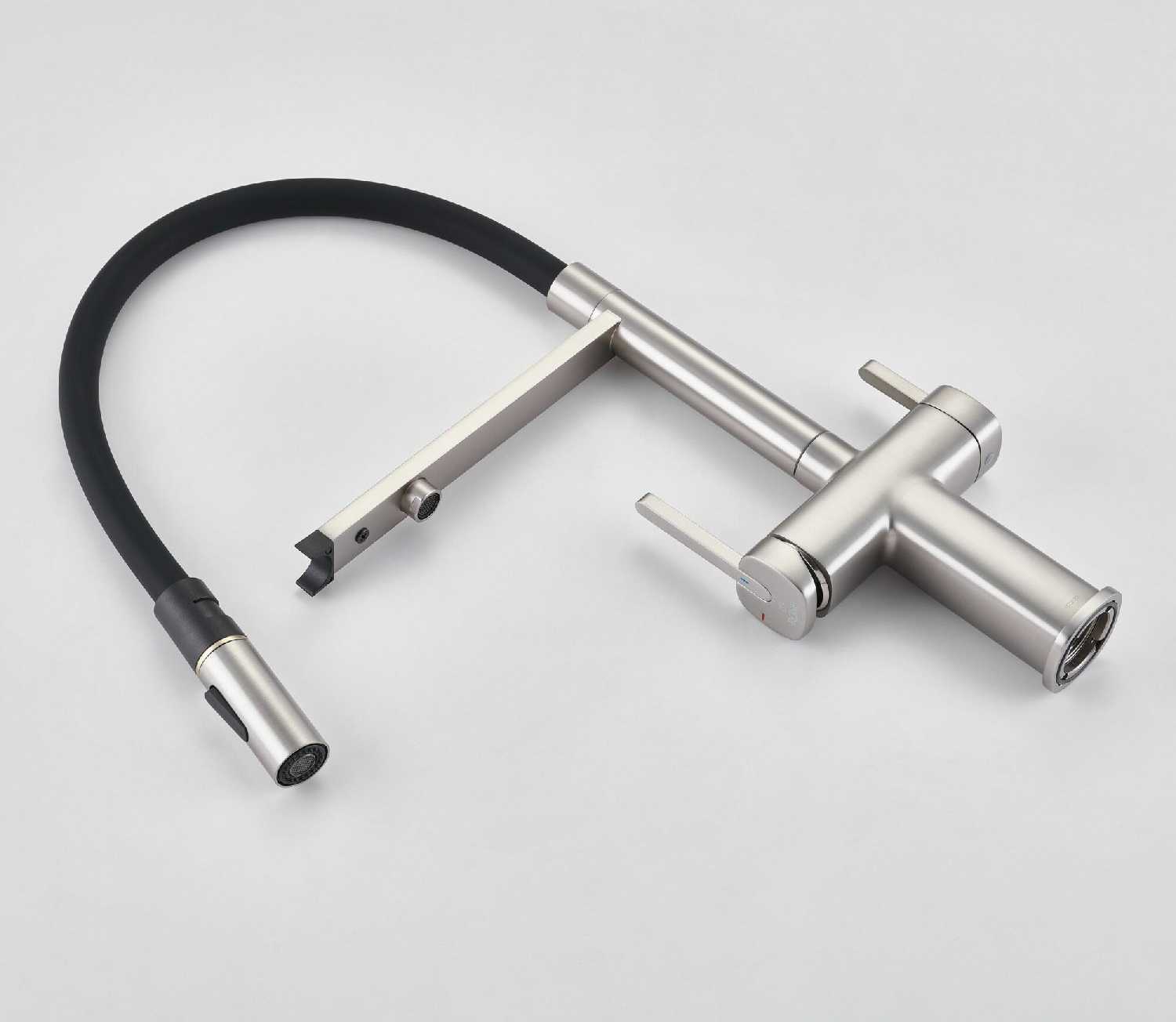 - + Это кран со встроенным краном для фильтра воды. Удобный, гнущийся шланг позволяет легко помыть продукты, посуду или саму раковину.