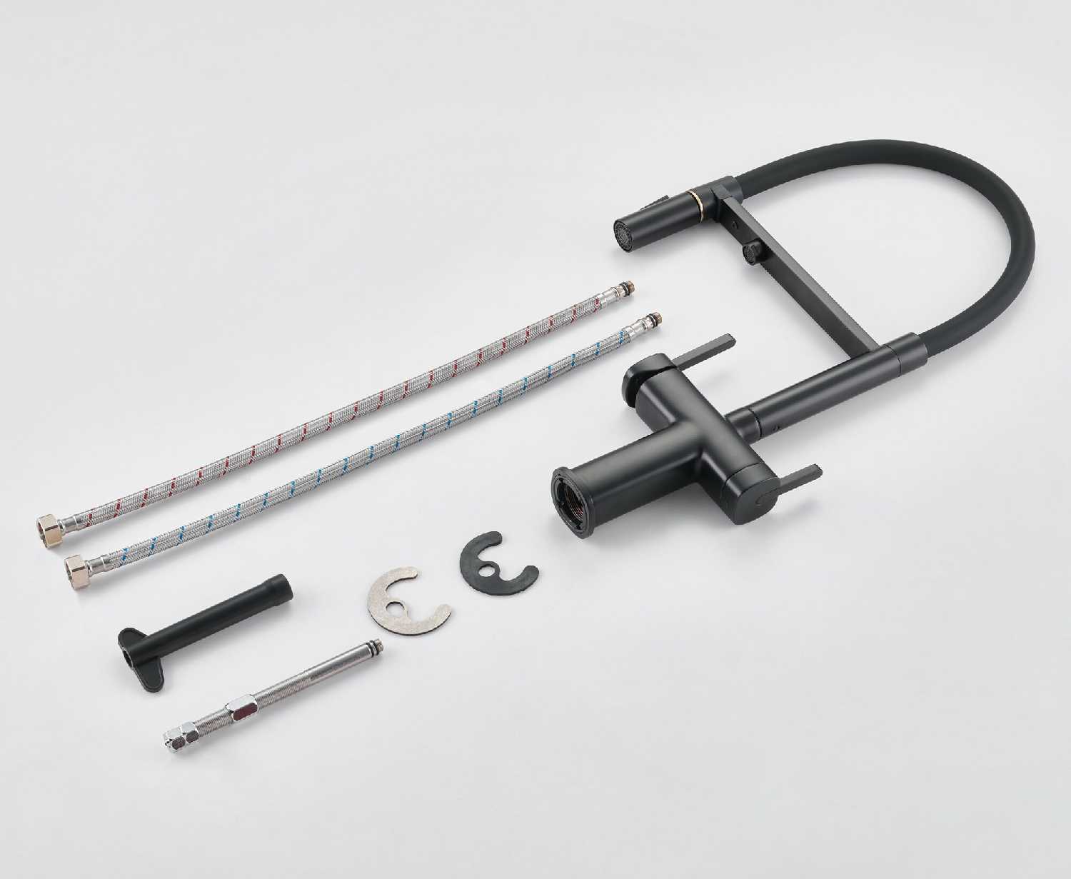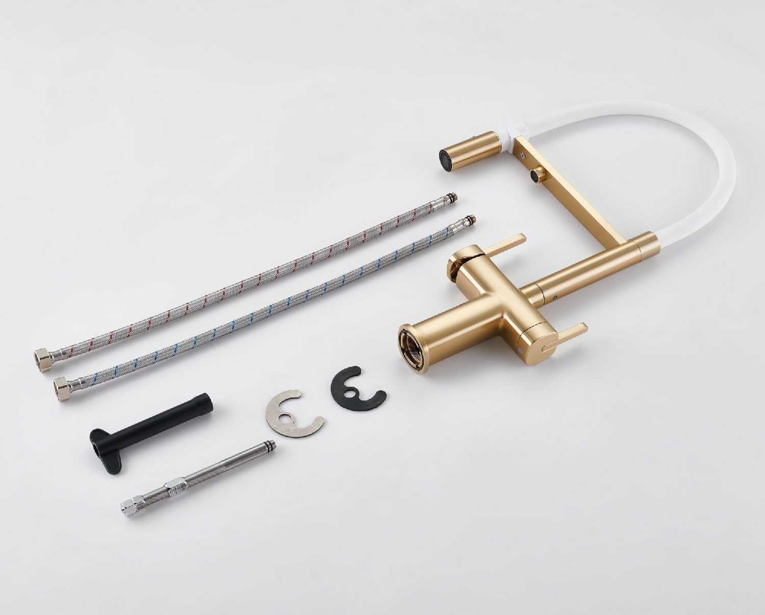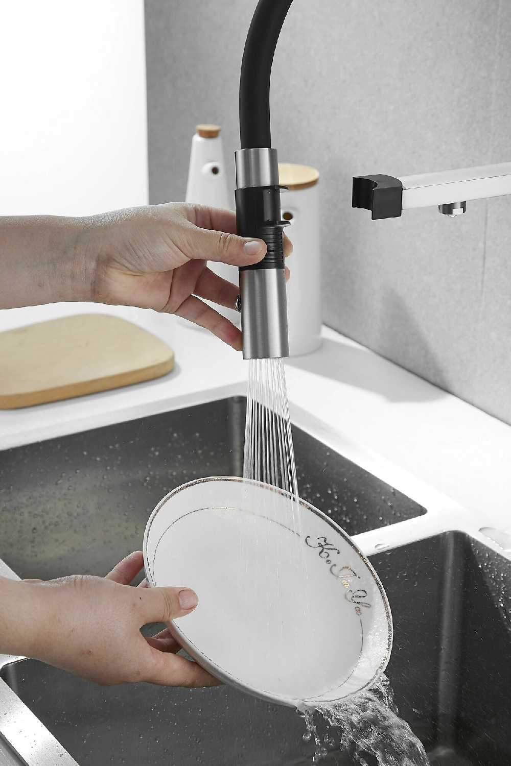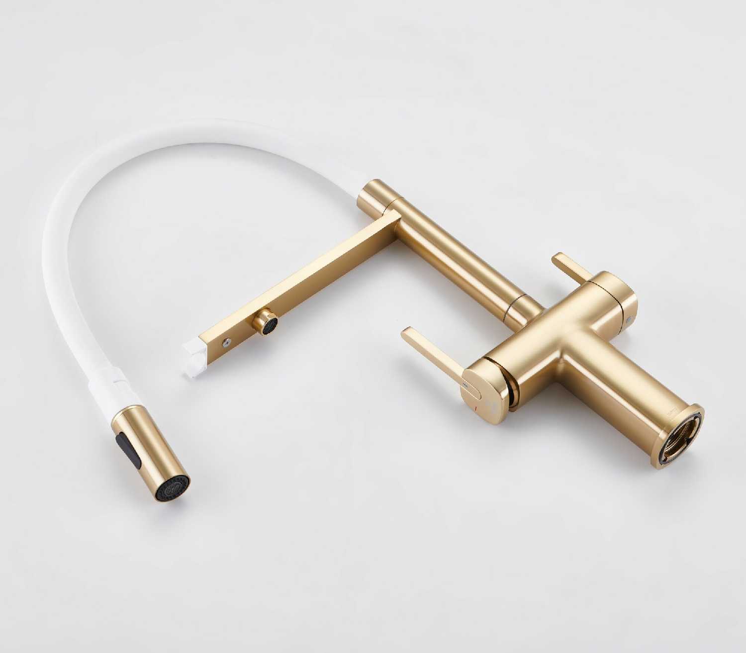 - + Это кран со встроенным краном для фильтра воды. Удобный, гнущийся шланг позволяет легко помыть продукты, посуду или саму раковину.
