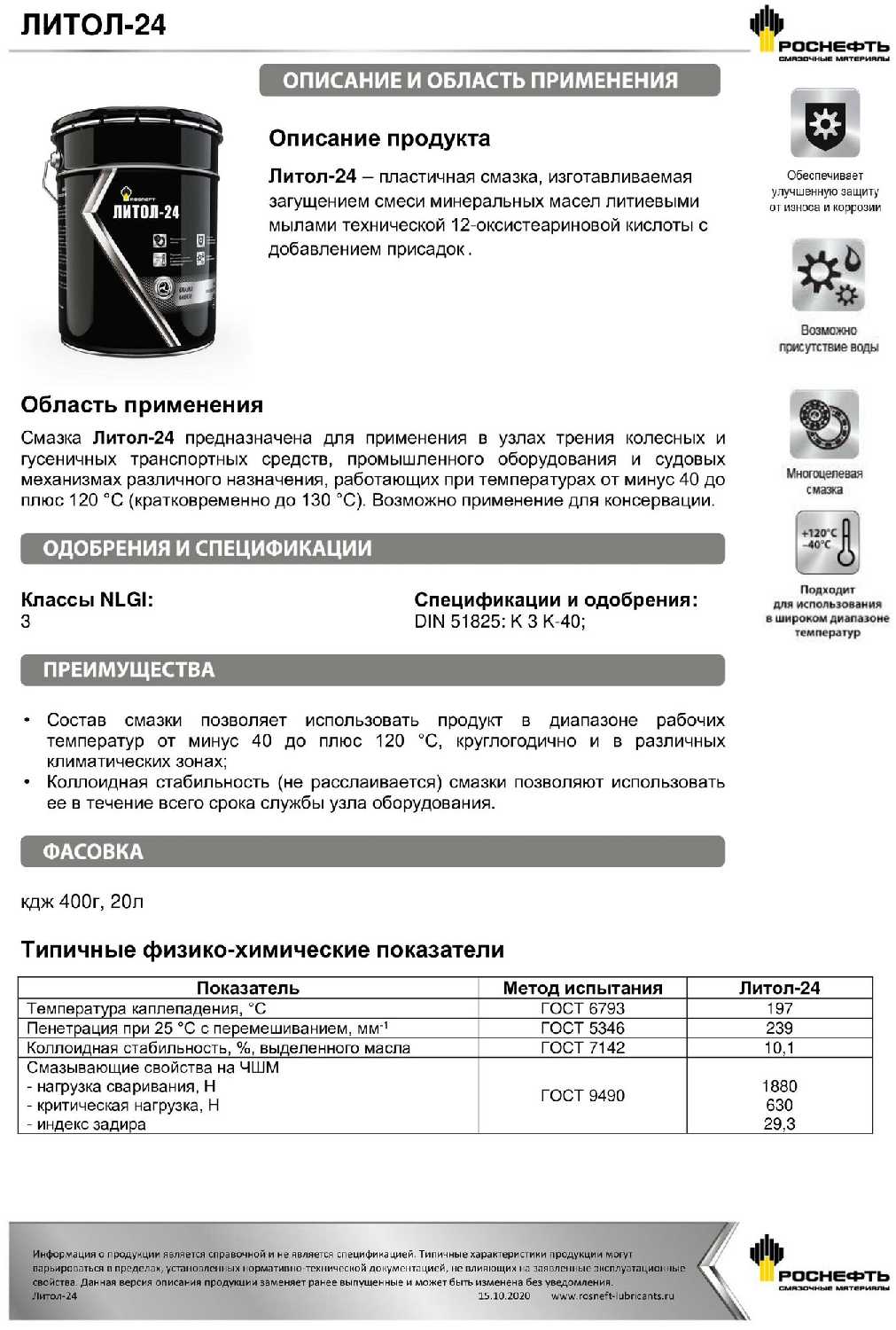 Способ применения : | Смазка Литол-24 предназначена для применения в узлах трения колесных и гусеничных транспортных средств, промышленного оборудования и судовых механизмах различного назначения, работающих при температурах от минус 40 до плюс 120 °С (кратковременно до 130 °С) |