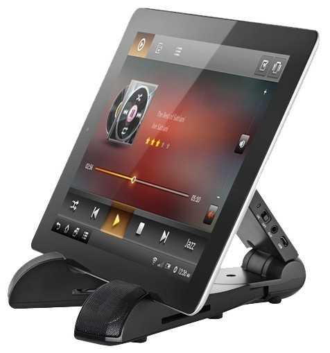 - + Только что получила и опробовала. К айпаду по блютуз подключилась без проблем. Подставка очень удобная, планшет держит прекрасно! Звук чистый и достаточно громкий, чтобы спокойно летом работать в саду/огороде и не скучать. И планшет будет стоять надежно, не надо ничего придумывать)