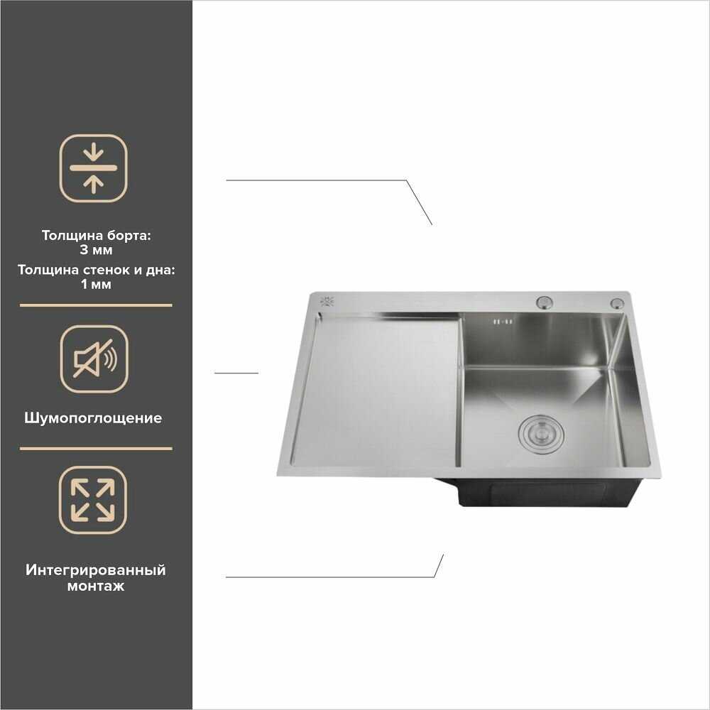 Конструкция самой раковины грамотная, есть два варианта с левым и правым крылом, крыло под углом, с углублением, поэтому если с посуды что-то течёт, то не попадает на столешницу, раковина глубокая и широкая, вмещает уйму посуды, кастрюльку, сковороду - для семьи из 3-4 человек в самый раз. Корзинка извлекаемая для мусора в раковине - очень удобно. Затычка хоть и не стандартная, зато в цвет раковины и не думаю, что может сломаться. Понравилось, покрытие стали с обратной стороны, отлично гасит вибрации и раковина не звенит от бегущей воды из крана. Форма раковины вниз идёт в виде пологой пирамиды, отлично спускает воду. И наконец-то не надо "трястись", как над "каменной" раковиной при падении туда тяжёлых приборов или при сливании кипятка(хотя по паспорту была до 110 градусов, но лопнула на 5 год, когда сливали макароны)