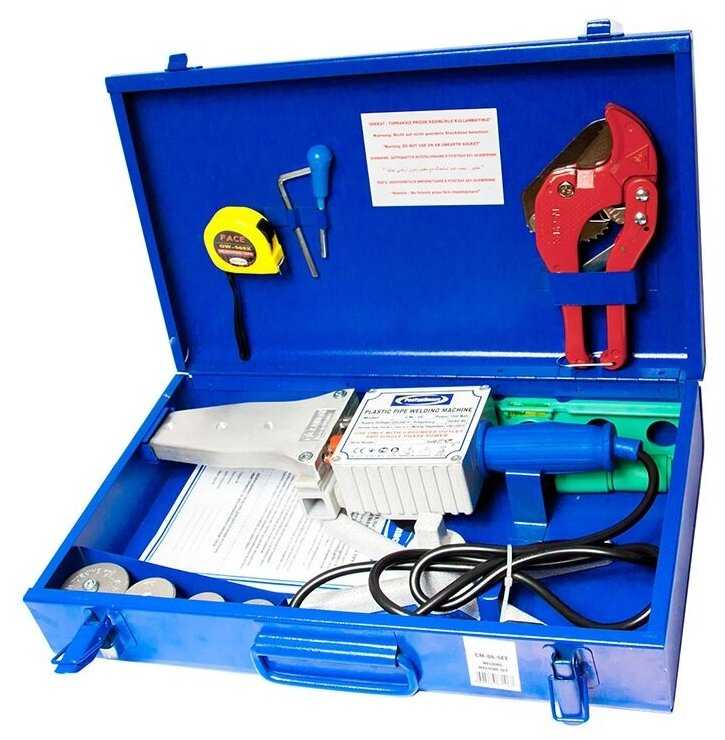 Хороший паяльник, нагревается быстро. Две тены одну отключаешь когда разогрелся и работаешь. Комплектные ножницы слабоваты, срез неровный на трубах от 25 и выше, но спаять можно.