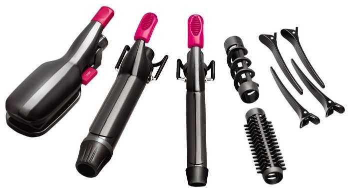 - В комплекте 5-7 керамических насадок (плойки разного диаметра, гофре, выпрямитель, спирали), позволяют создавать кудри, волны, объем и выпрямлять волосы.