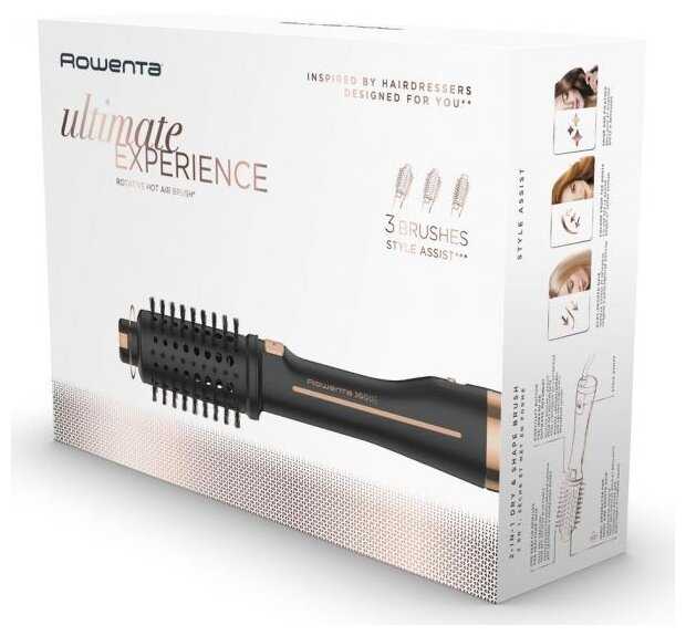 - Щетка вращается в обе стороны, имитируя движения стилиста, что позволяет создавать разные типы укладок (завитки внутрь или наружу).