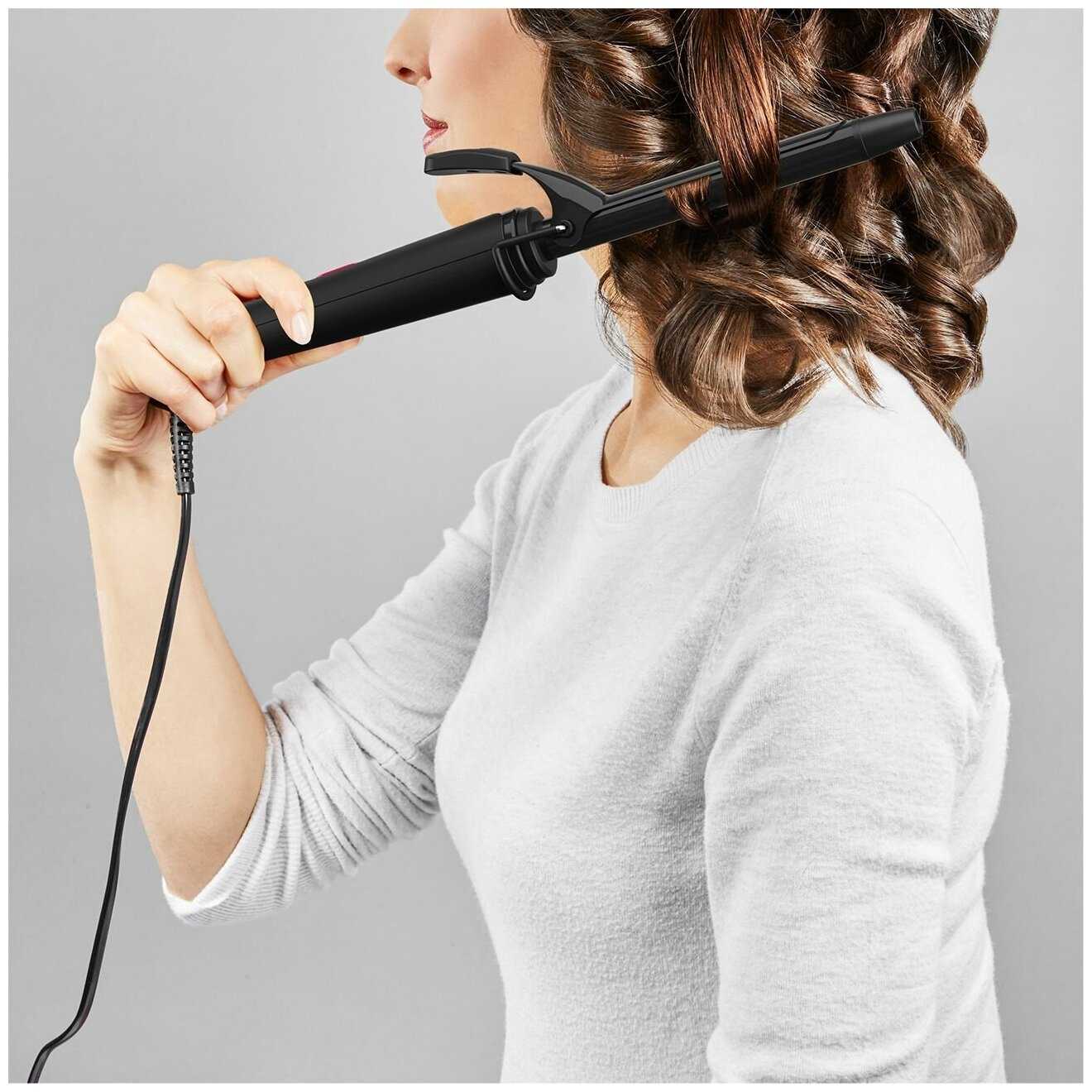 - Плотный зажим надежно удерживает пряди толщиной до 4 см, создавая упругие завитки.
